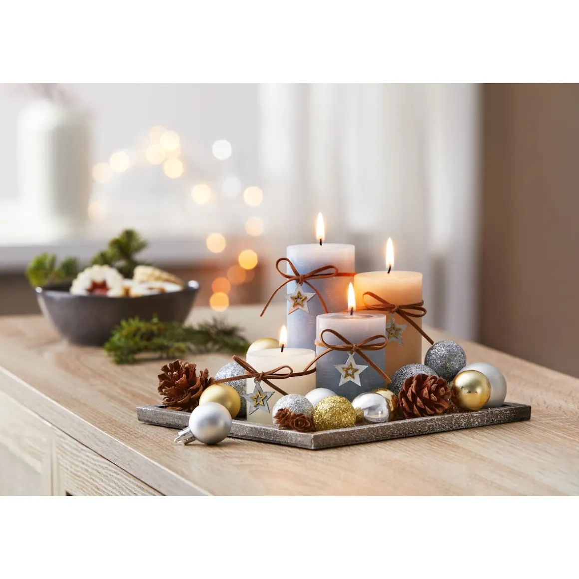 So unkompliziert zaubern bestimmt auch Sie gerne vorweihnachtliche Stimmung in Ihr Zuhause: Dieser Adventsteller sorgt mit seiner natürlichen Dekoration und seinem sanften Kerzenlicht für winterliche Wohlfühlmomente. So ersetzt er spielend leicht jeden aufwendig gebundenen Kranz.
