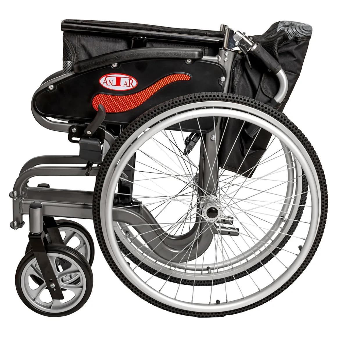 Ein Modell der Extraklasse: leicht, mit modernem S-förmigen Aluminiumrahmen. Fußstützen schwenkbar und abnehmbar, Rückenlehne klappbar. Mit Wabenhinterrad für Stoßdämpfung. Vorradgabel Hochleistungs-Aluminium. manuelle Bremse. Rückenlehne und Sitzfläche aus pflegeleichtem Material, bequem gepolstert.