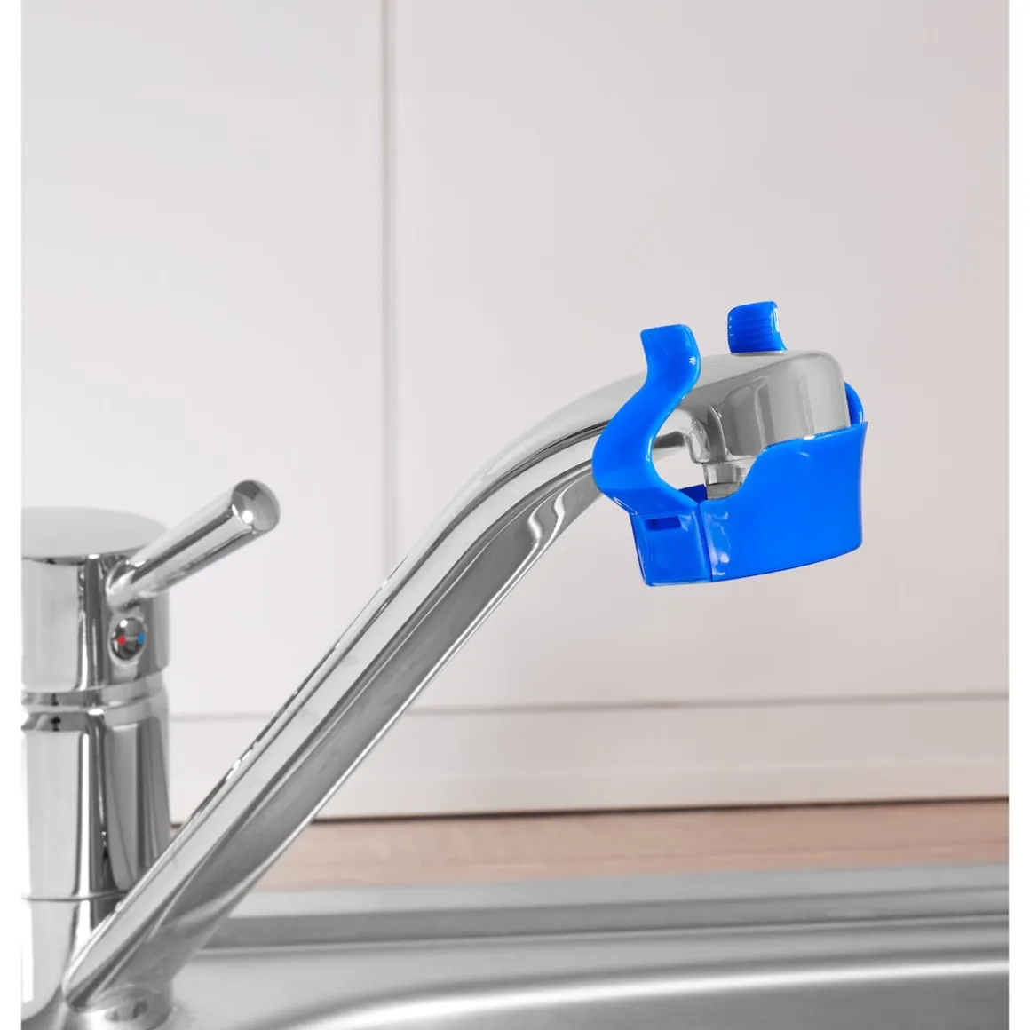 Der Aufsatz krallt sich sicher an fast allen gängigen Wasserhähnen fest, wird mit Kalkreiniger gefüllt – und befreit so von lästigem Kalk.