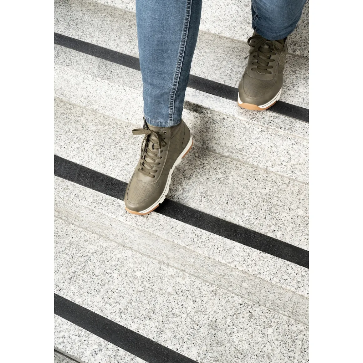 Schluss mit Rutschpartien; Band einfach auf die gewünschte Länge zuschneiden und auf rutschige Treppenstufen, Rampen oder andere glatte Flächen kleben – so bleibt jeder Schritt sicher!