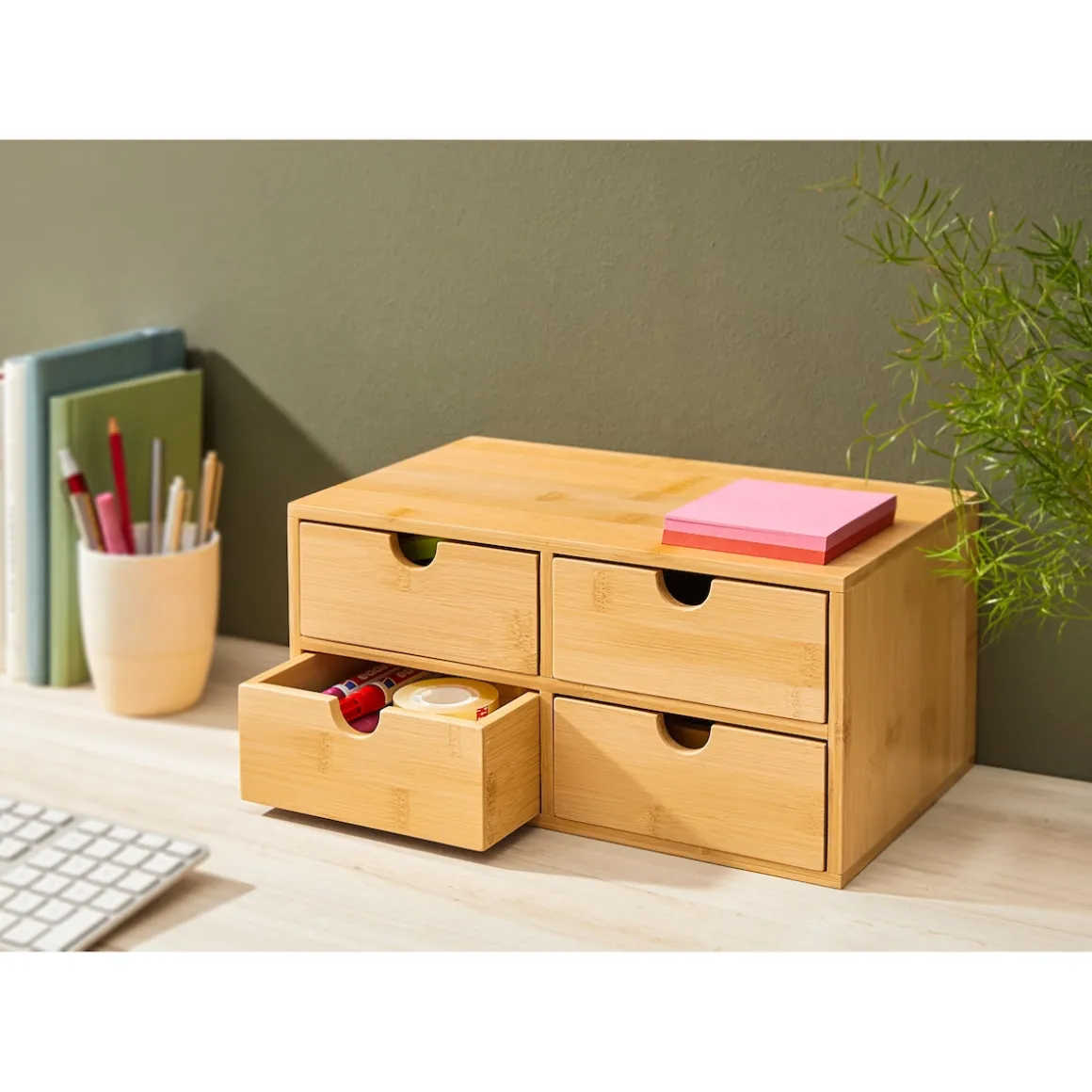 Dieser Ordnungshelfer bringt Natur pur in Ihr Büro, Bad oder in die Küche: Der warme Bambuston sorgt für eine angenehme Atmosphäre. 4 herausziehbare Schubladen bieten jede Menge Stauraum für kleine Gegenstände. Robust, langlebig und umweltfreundlich – Bambus ist ein schnell nachwachsender Rohstoff.