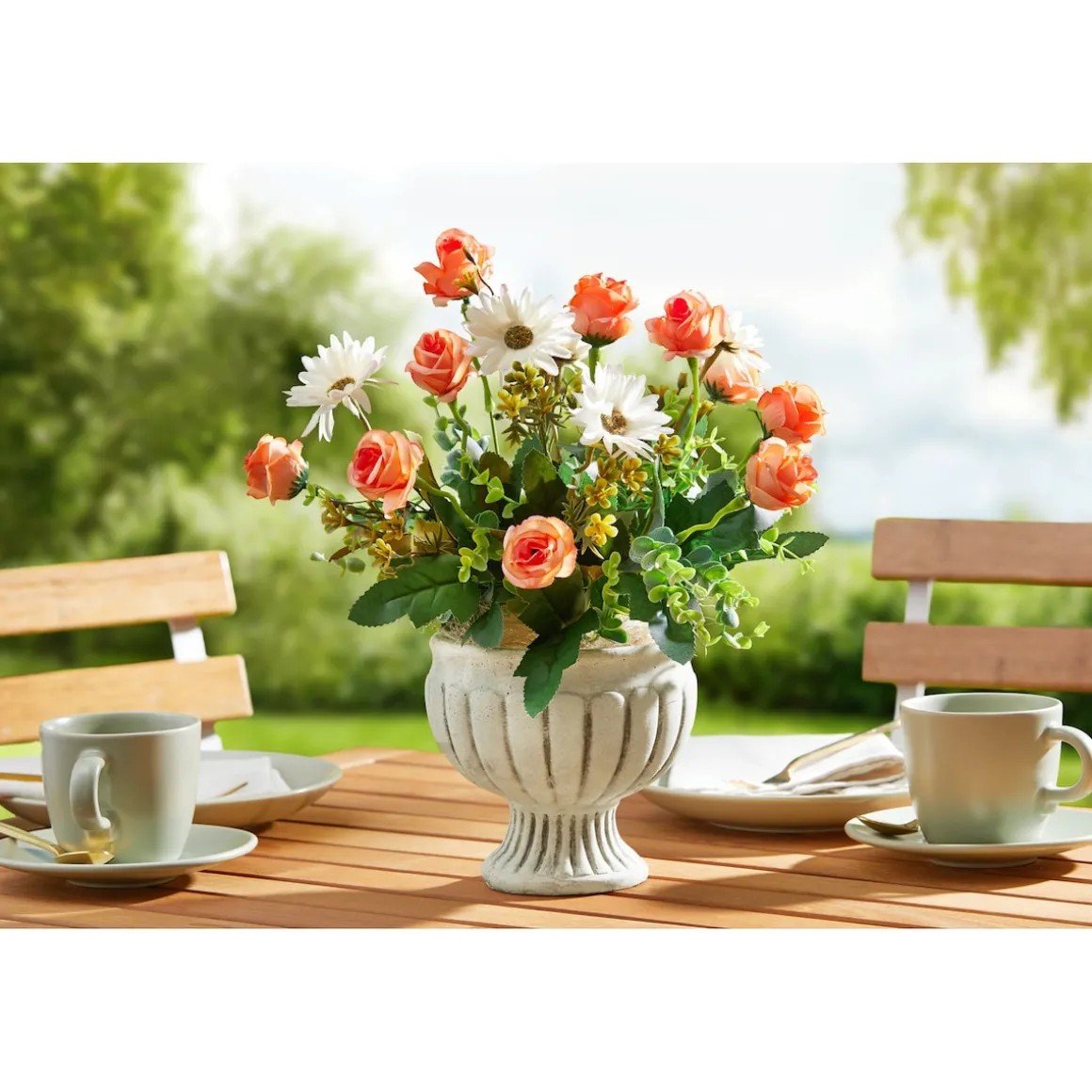 Ein frischer Strauß Blumen macht jeden Tisch noch schöner. Dieses echt wirkende, edle Arrangement aus Rosen und Margeriten im Pokalgefäß bleibt für immer frisch und imponiert als dekoratives Gesamtpaket im Landhausstil.