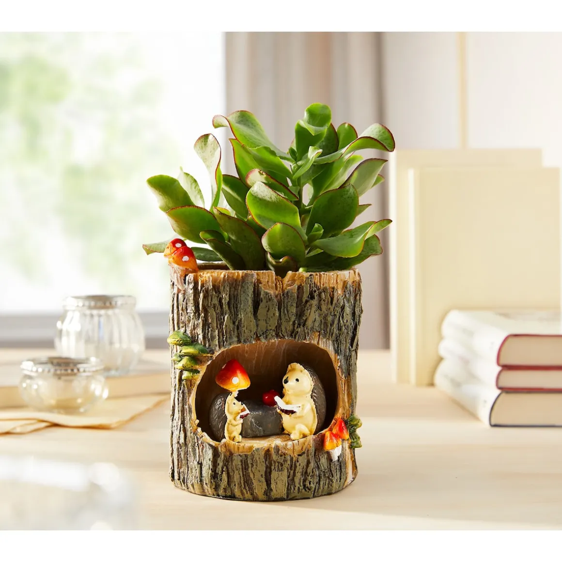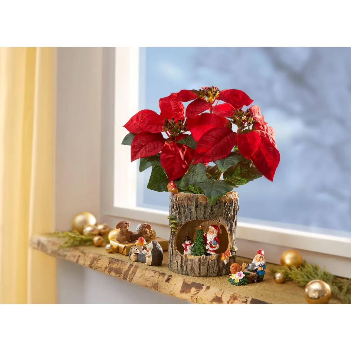 Eine entzückende Idee: Für diesen charmanten Pflanztopf in Baumrindenoptik haben Sie stets die passende Dekoration zur Hand! Gartenzwerg, Osterhäschen, Herbst-Igelchen und das niedliche Schnee-/ Weihnachtsmann-Duo wechseln sich – nach Jahreszeit – im Schaufenster ihres Zuhauses ab.