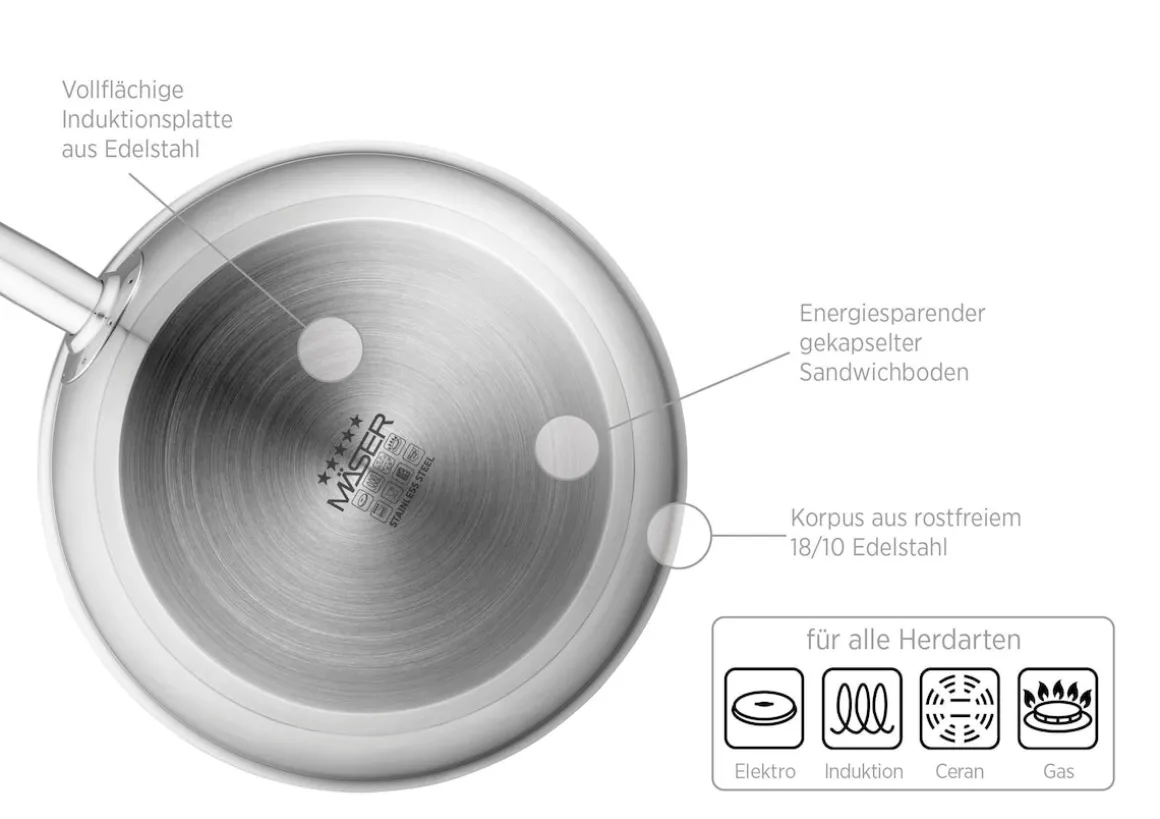 PROFESSIONAL I – die Serie für den Profi und alle Hobbyköche mit besonderen Ansprüchen. Die umfangreiche Serie aus hochwertigem Edelstahl 18/10 glänzt mit tollen Produkteigenschaften: Verkapselter Sandwichboden 5mm mit optimaler Hitzeverteilung, und hitzebeständige Griffe. Selbstverständlich sind alle Teile induktionsfähig, backofenfest bis 240°C und spülmaschinengeeignet. Zusätzlich zu Kochtöpfen in diversen Ausführungen und Größen bietet die Serie noch 4 Bratpfannen mit oder ohne Beschichtung.