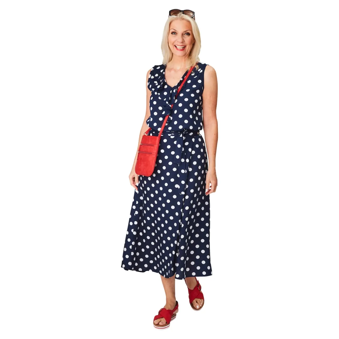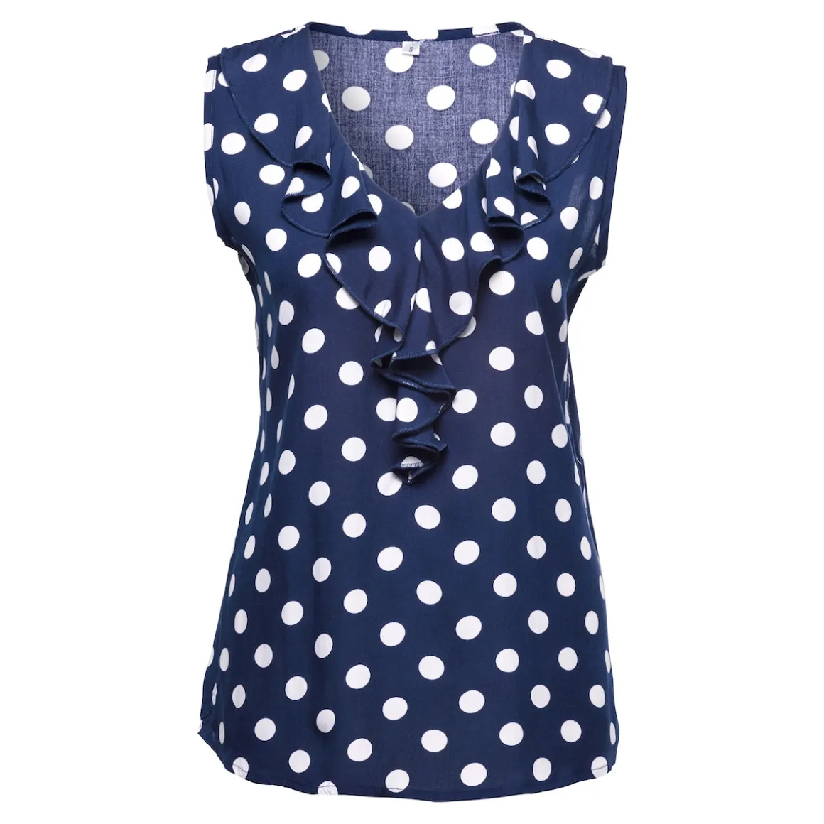 Weiße Punkte auf dunklem Marineblau – die klassisch elegante Optik dieser Bluse passt gleichermaßen für Büro oder Sommerfest. Das weich fließende Material trägt nicht auf und schmeichelt somit jeder Figur. Der breite Rüschenbesatz am V-Ausschnitt der Bluse setzt einen attraktiven Akzent.