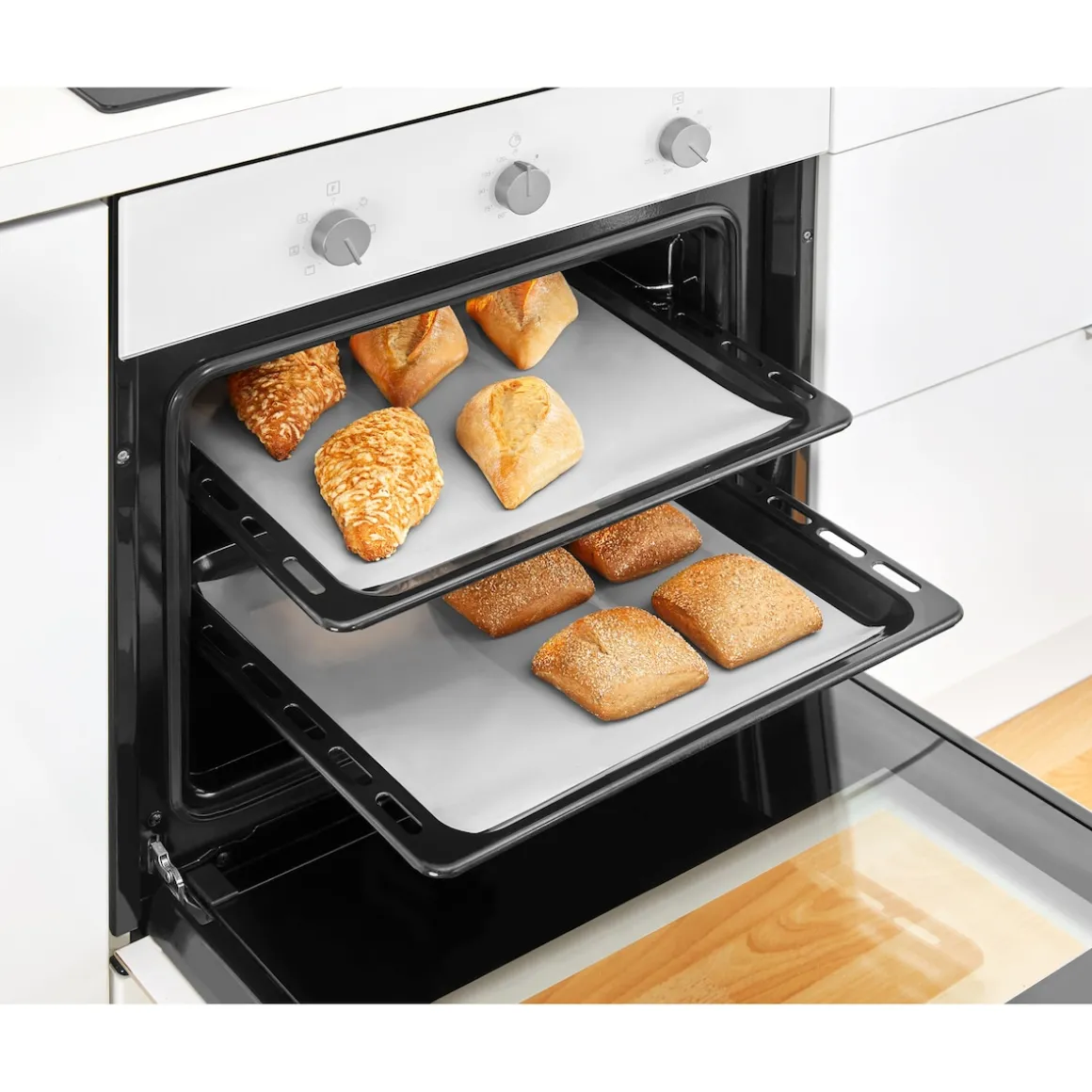 Weil das niemand gerne macht, gleich die Dauer-Backfolie mitbestellen. Die hält das Backblech dauerhaft sauber, lässt sich feucht abwischen und bis zu 1.000 Mal wiederverwenden.