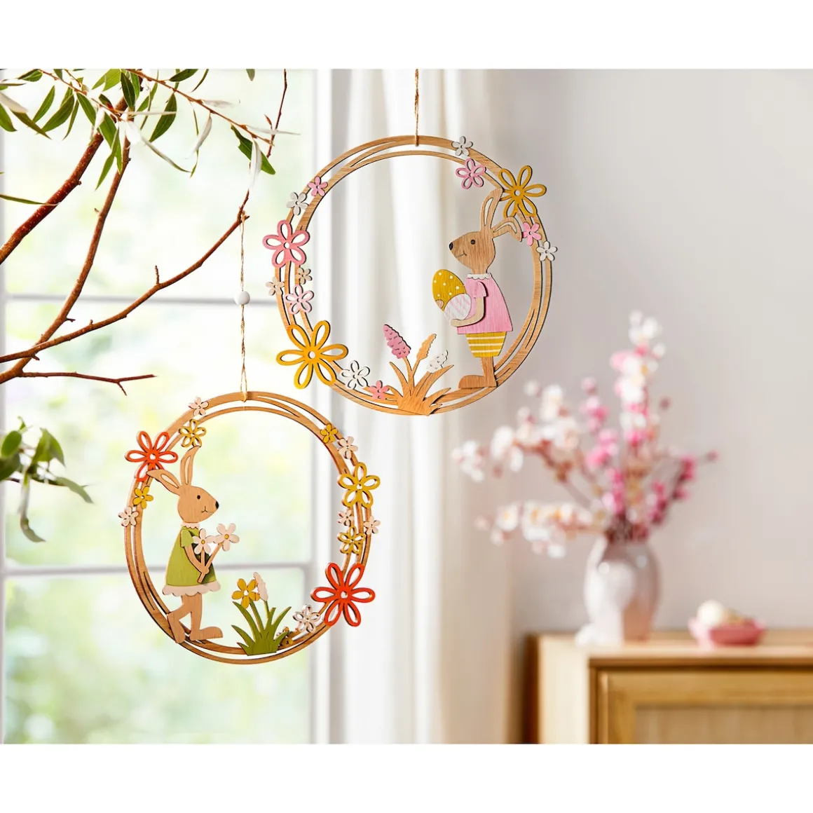 Das liebenswerte Hasenpärchen weiß, was Ihnen Freude macht und eilt mit einem hübschen Blumengruß und buntem Osterei herbei. Die beiden Langohren kommen als fröhliche Zierde am Osterstrauß oder an Türen und Fenstern besonders gut zur Geltung.