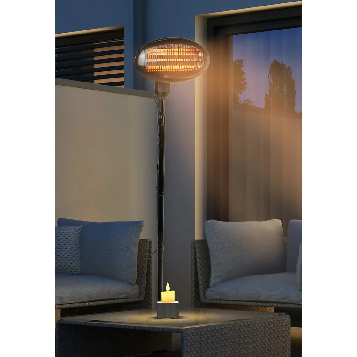 Mit dem elektrischen Stand-Heizstrahler lassen sich auch im Frühjahr und Herbst sowie an kühleren Sommerabenden viele gemütliche Stunden im Freien verbringen. Dem ausgiebigen Frühstück mit der Familie auf dem Balkon oder dem Grillfest mit Freunden im Garten steht auch dann nichts mehr im Wege, wenn das Wetter einmal nicht mitspielt. Der praktische Heizstrahler eignet sich ideal für den Einsatz auf Terrasse und Balkon sowie im Wintergarten, Garage und Keller. Die angenehme Strahlungswärme kann auf den Punkt genau ausgerichtet werden, für einen sicheren Einsatz verfügt das Gerät über die Schutzart IP34.