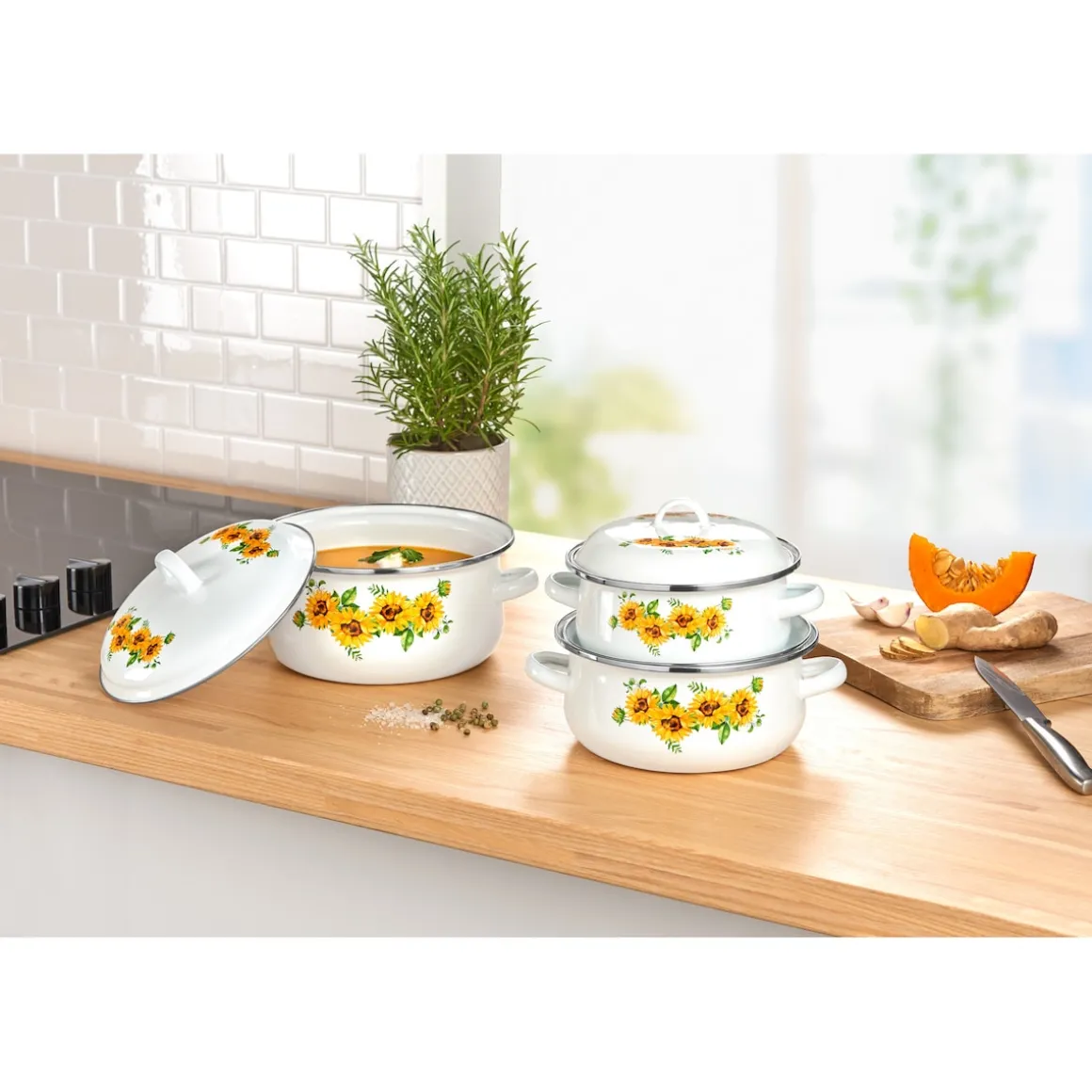 Kochen Sie mit Leichtigkeit und servieren Sie köstliche Speisen mit unserem 6-teiligen Emaille-Topfset. Die Töpfe, ausgestattet mit passenden Deckeln, kommen in drei praktischen Größen und lassen sich platzsparend ineinander verstauen. Jeder Topf ist spülmaschinengeeignet und ermöglicht so eine leichte Reinigung. Sie sind für alle Herdarten geeignet, einschließlich Ceran, Gas und Induktion. Bereiten Sie schmackhafte Gerichte zu und zaubern Sie Ihren Gästen ein Lächeln ins Gesicht!