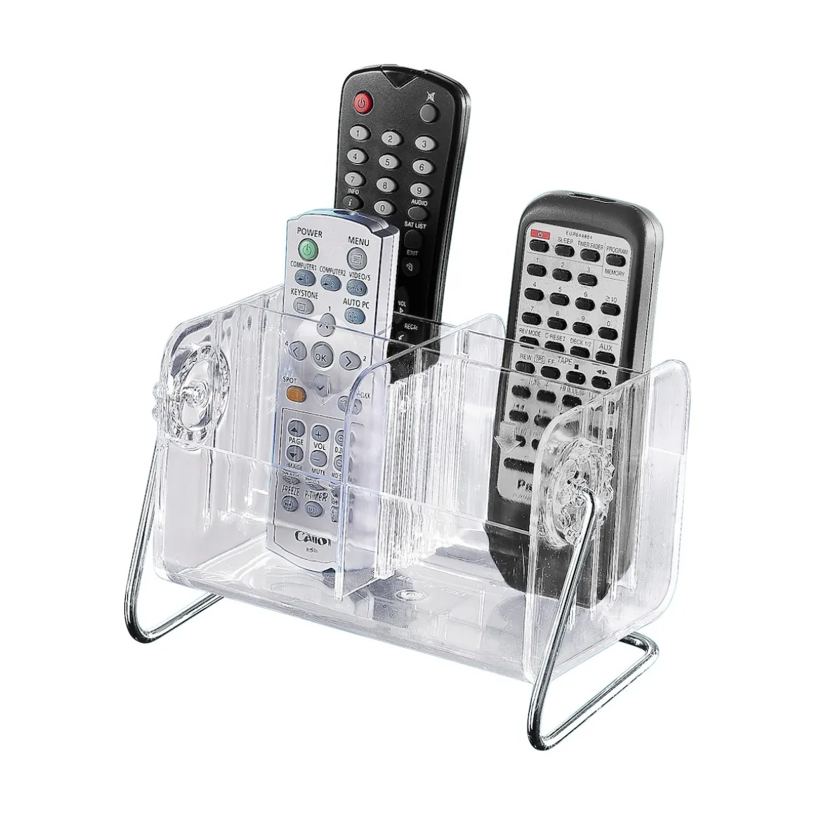 Diese Frage wird mit der Fernbedienungs-Orga überflüssig! Auf einer Größe von 16 x 11 x 10 cm bietet sie 6 Fächer für Fernbedienungen und Mobiltelefone. Ausführung aus Acryl mit verchromtem Metallbügel und Anti-Rutsch-Polstern.