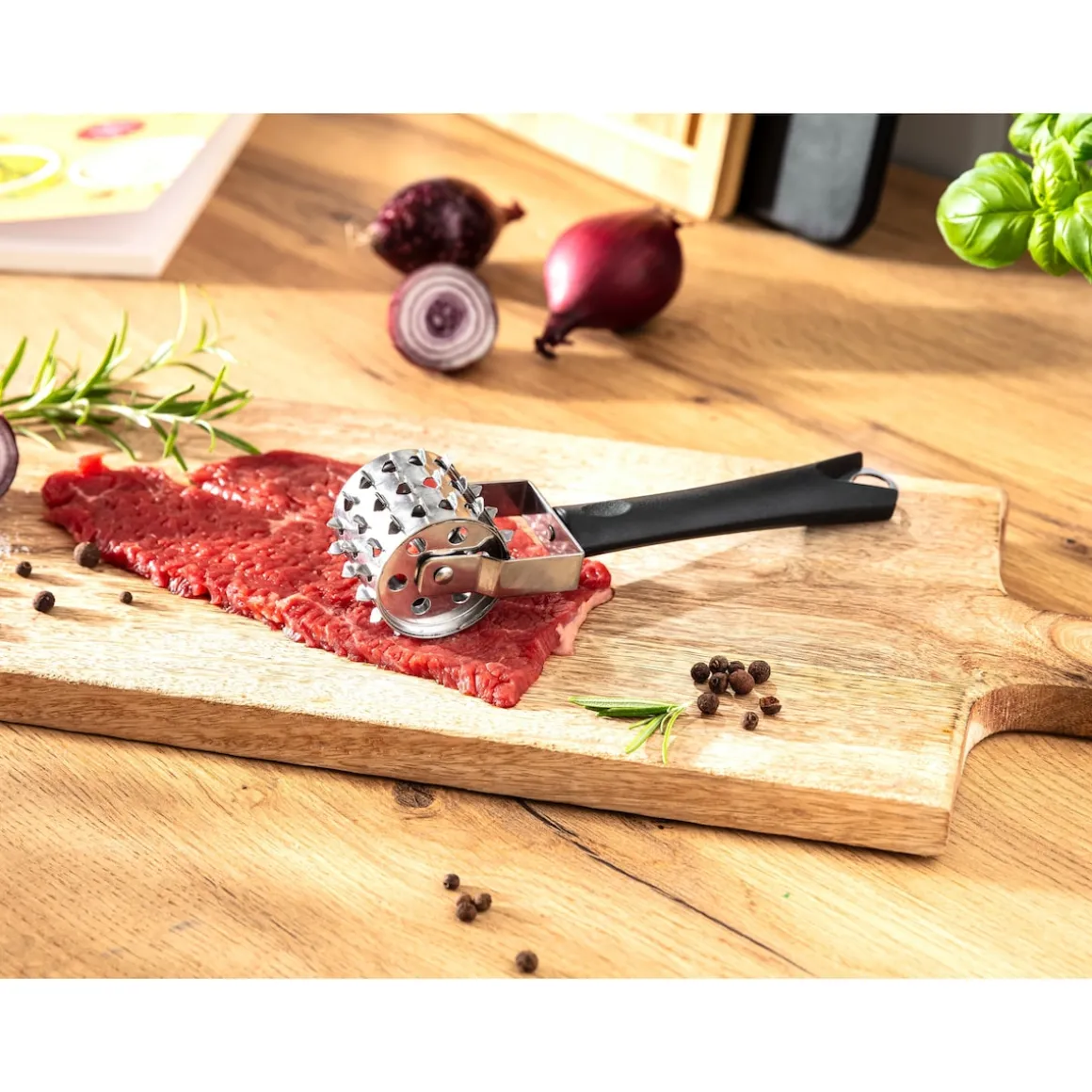 Einfach rollen: Die Klingen dieser langlebigen Walze lockern die Fleischfasern – das macht Steaks extra zart und verbessert zudem die Aufnahme von Gewürzen und Marinaden.