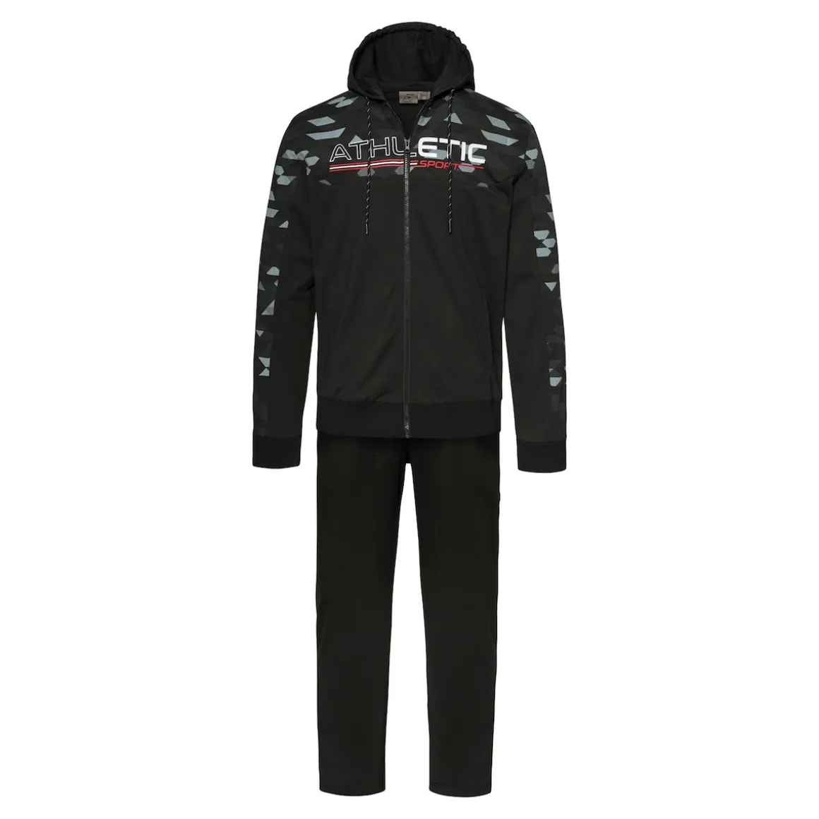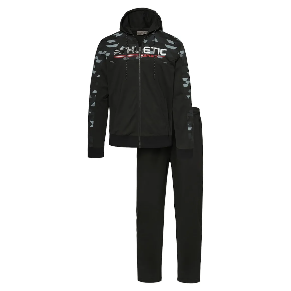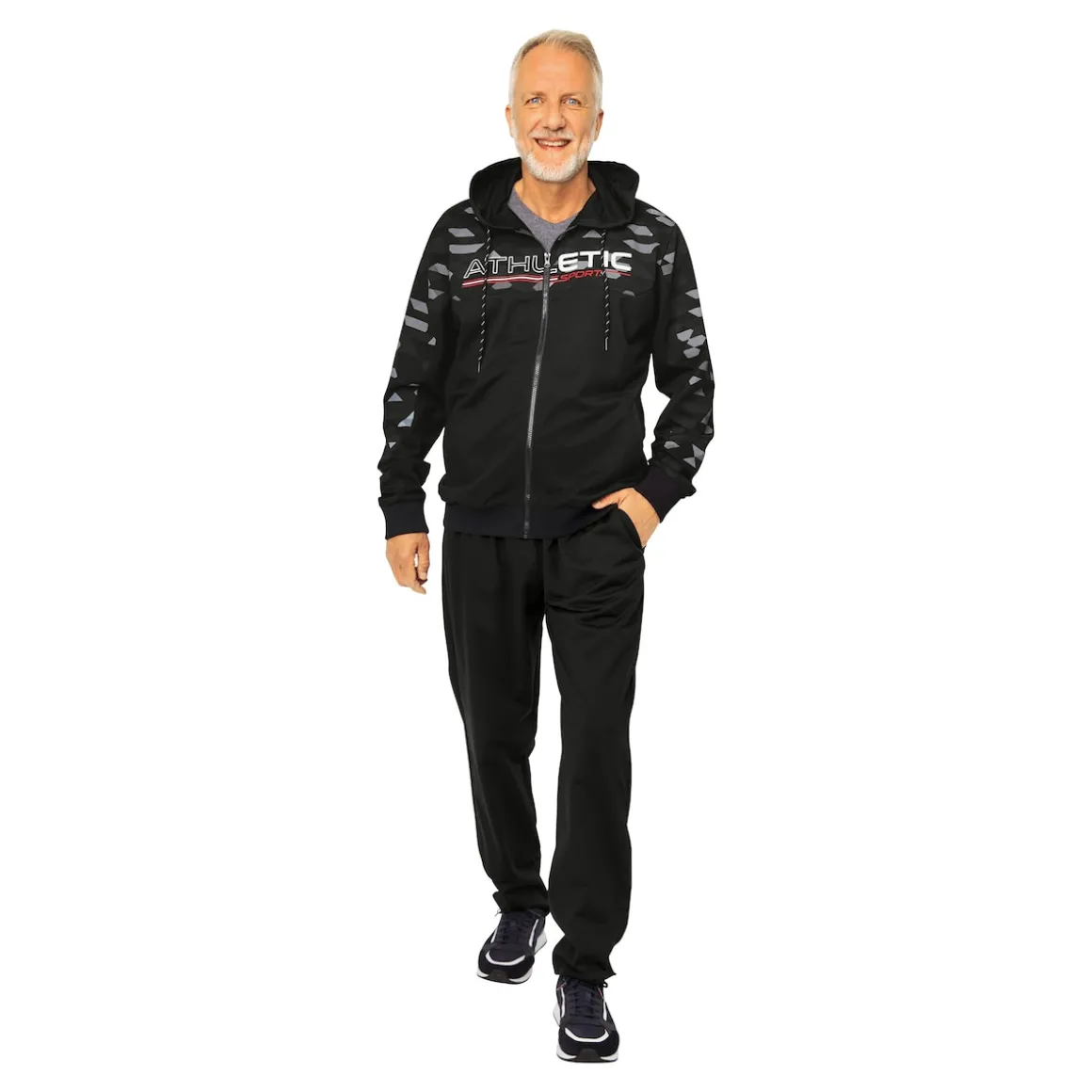 Machen Sie sich’s gemütlich – in diesem bequemen Freizeitanzug! Seine Jacke punktet mit durchgehendem Reißverschluss, sportlichem Print auf Brusthöhe, Kapuze sowie 2 Einschubtaschen. Diese finden sich auch seitlich in der Hose, die Ihnen dank elastischem Gummizug, Innenkordel und offenem Beinabschluss einen hohenTragekomfort bietet.