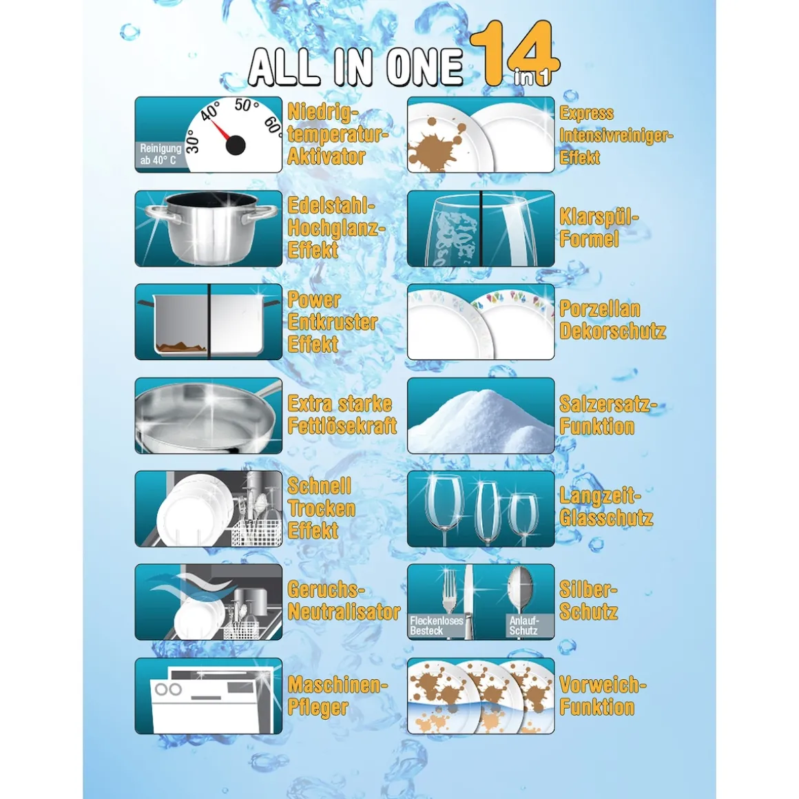 Tauchen Sie ein in eine Welt makelloser Sauberkeit mit unserem All in One Geschirrspülpulver. Dank einer innovativen Rezeptur reinigt dieses Pulver Ihr Geschirr in der Spülmaschine nicht nur gründlich, sondern auch schonend. Mit seinen 14 Funktionen in einem Produkt revolutioniert es die Art und Weise, wie Sie Ihr Geschirr spülen. Nie mehr Kompromisse – nur perfekte Ergebnisse.