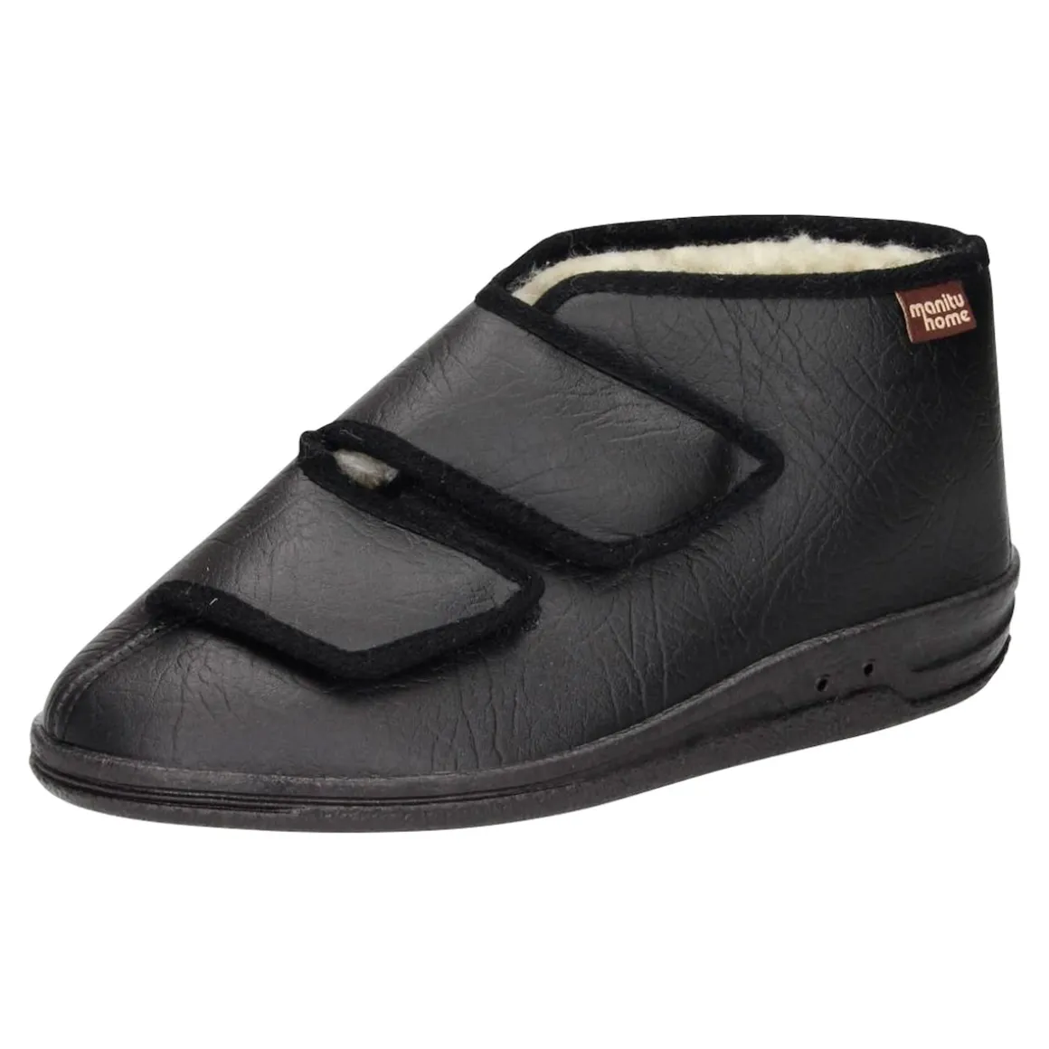 Weit zu öffnen, mit 2 Klettverschlüssen individuell einstellbar. Mit kuscheligem Futter aus Schurwolle. Obermaterial aus Lederimitat, Decksohle aus Schurwolle. Rutschhemmende TR-Laufsohle.