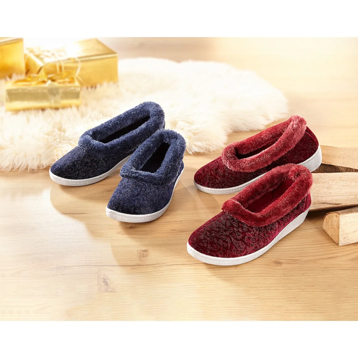 Zu Hause ist es doch am schönsten. Umso mehr noch, wenn die Füße kuschelig eingepackt sind. Dafür sorgt dieser Hausschuh mit herrlichem floralem Muster. Durch den leichten Keilabsatz von 3,5 cm haben Sie ein besonders angenehmes Gehgefühl. Mit Kunstfell am oberen Rand.