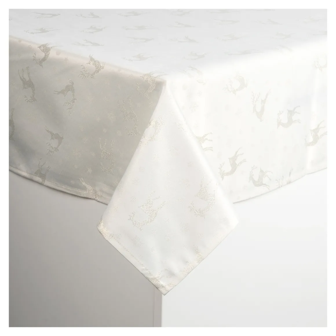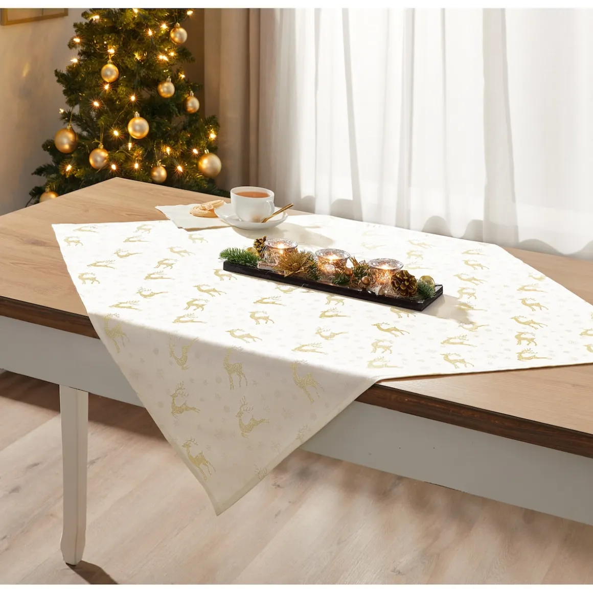 Diese Jacquard-Mitteldecke verleiht Ihrem Tisch eine festliche Atmosphäre. Mit ihren goldbestickten Rentiermotiven und der hochwertigen Jacquard-Qualität setzt sie elegante Akzente in Ihrem Zuhause. Die sorgfältige Verarbeitung garantiert Langlebigkeit und pflegeleichte Handhabung. Lassen Sie sich von „Rentierzauber“ inspirieren und schaffen Sie eine einladende Wohlfühlatmosphäre.