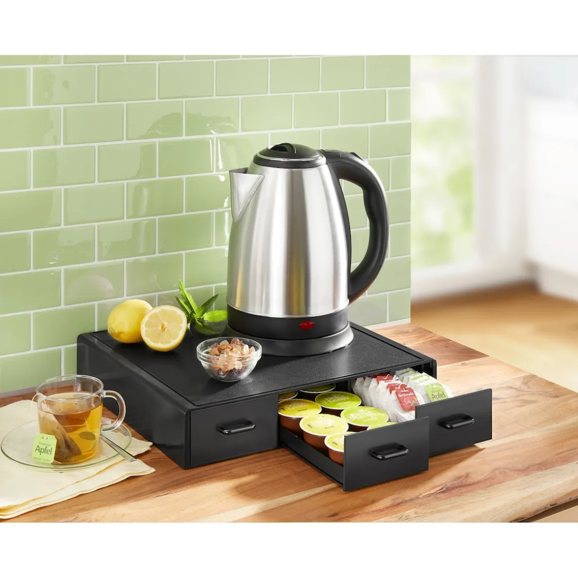 Für Küche oder Büro-Pausenräume: Die praktische Aufbewahrungslösung für Tee und Kaffee lässt Sie schnell eine Entscheidung treffen. Ordentlich in 3 Schubladen mit 6 Fächern sortiert, haben Sie alle Vorräte im Blick. Top: Der Organizer trägt auch Ihre Kaffeemaschine oder Ihren Wasserkocher.
