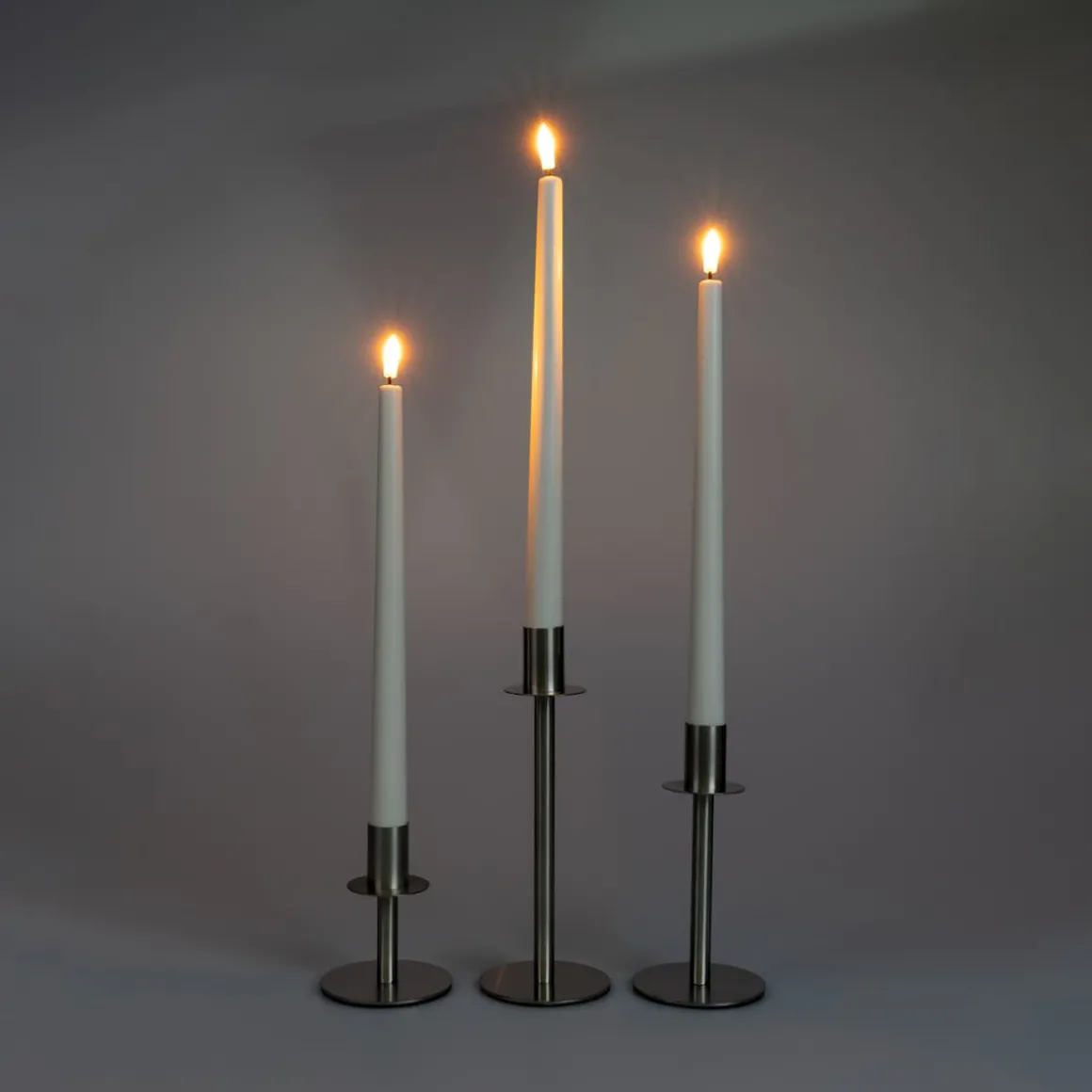 Inhalt: 3 LED-Echtwachskerzen, 3 Edelstahl-Kerzenständer