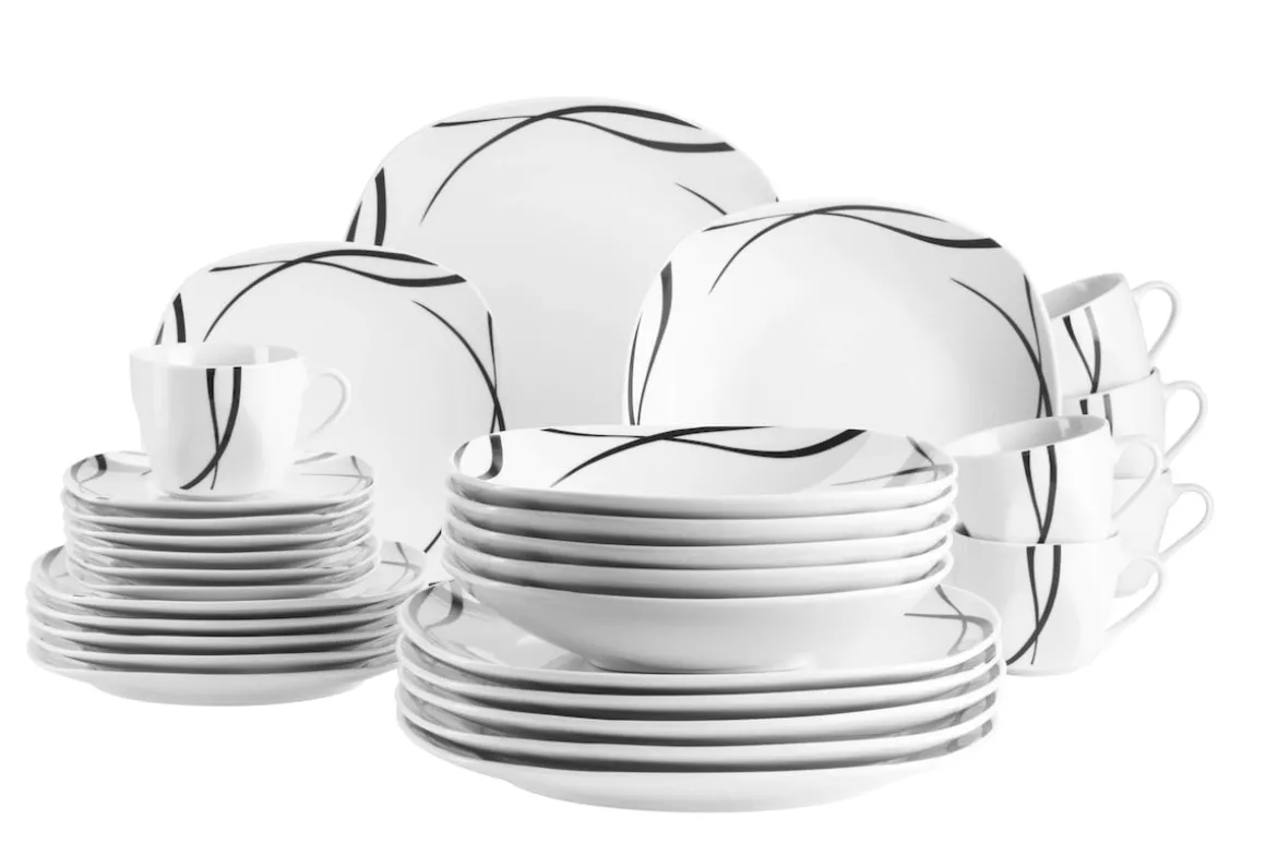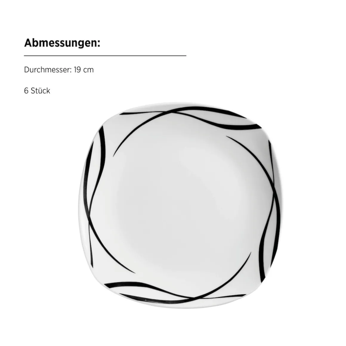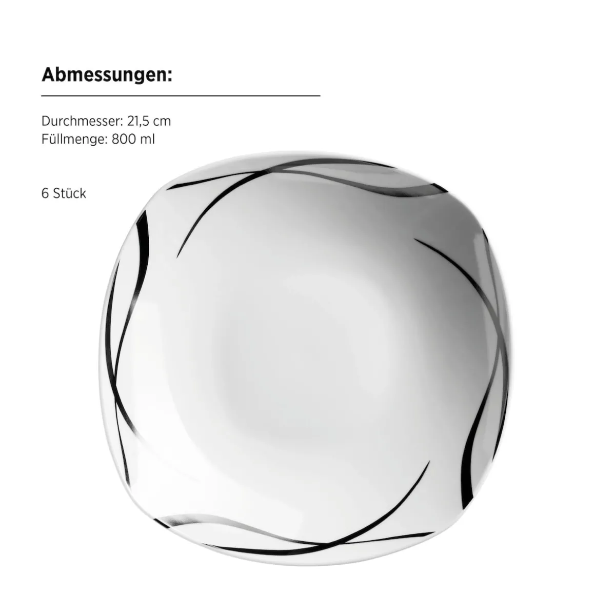 Mehr als nur weißes Geschirr: „Decora“ kombiniert klassisches weißes Porzellan mit modernen Formen und einem zeitlosen, schwarzen Dekor. Das Porzellangeschirr punktet mit eckig anmutenden Formen und schönem Glanz. An „Decora“ werden Sie sich gewiss viele Jahre erfreuen können. Die Serie bietet Speiseteller, tiefe Teller, Dessertteller und Kaffeetassen mitsamt Untertassen. Das pflegeleichte Geschirr ist zu 100% alltagstauglich und für Spülmaschine sowie Mikrowelle geeignet.