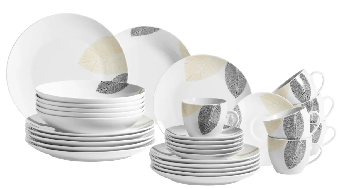 Die Porzellangeschirr-Serie JONAS der österreichischen Traditionsmarke MÄSER präsentiert sich mit einem großflächigen, feingliedrigen Blätterdekor auf modernen randlosen Formen. Verspielt und dennoch elegant, klassisch und zugleich modern – die Schönheit dieser Kollektion ergibt sich aus der Verbindung von traditionellen und topaktuellen Design-Elementen. Dieses Kombiservice für 6 Personen bietet eine Ihnen solide Ausstattung für den Einsatz vom Frühstück über den Nachmittagskaffee bis hin zum dreigängigen Dinner. Alle Teile sind dauerhaft spülmaschinen- und mikrowellengeeignet, und dadurch äußerst pflegeleicht. Die in den Fotos angegebenen Füllmengen beziehen sich aus Gründen der Vergleichbarkeit auf eine Befüllung bis zum oberen Gefäßrand, bei den Abmessungen handelt es sich um Außenmaße.