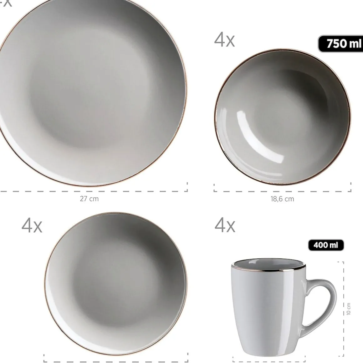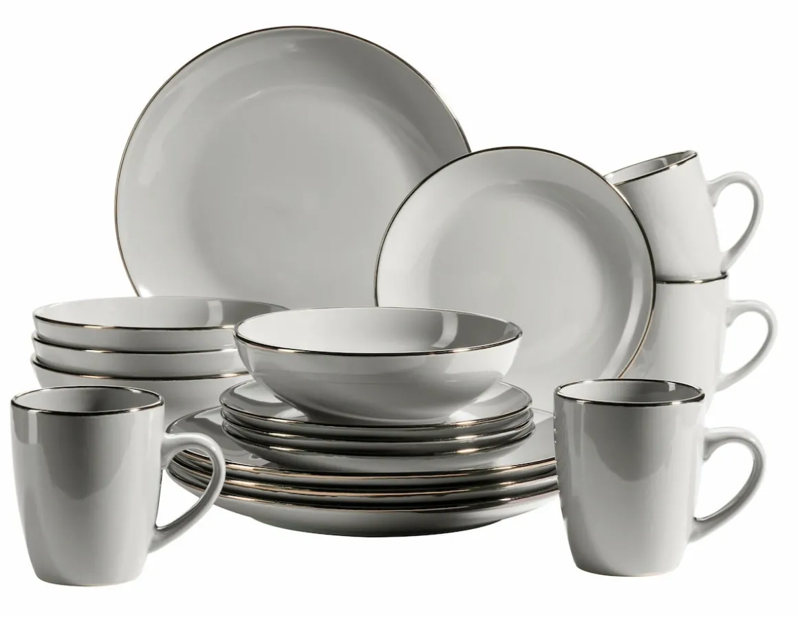 Die Kollektion METALLIC RIM der österreichischen Traditionsmarke MÄSER kombiniert auf erfrischende Weise modernes Design in Material, Form- und Farbgebung mit festlicher Eleganz. Trotz seiner messingfarben schimernden Umrandung ist dieses Geschirrset spülmaschinen- und mikrowellengeeignet, und damit äußerst pflegeleicht. So verzaubert die Serie METALLIC RIM Ihre Gäste nicht nur zu besonderen Anlässen, sondern wertet Ihren Esstisch auch im Alltag auf. Ein besonderes Highlight ist die großzügige Mehrzweckschale, die Müslischale und Suppenteller im Zeitgeist des Bowl-Trends vereint. Dieses Service wird in einer speziell für dieses Set entwickelten, vielfach getesteten Transportverpackung aus umweltfreundlicher Wellpappe versendet. Zur besseren objektiven Vergleichbarkeit gehen unsere Füllmengenangaben von einer randvollen Befüllung aus. Bitte beachten Sie: Die Serie METALLIC RIM wird händisch glasiert, wodurch leichte Unebenheiten, kleine Einschlüsse und minimale Farbabweichungen auftreten können.