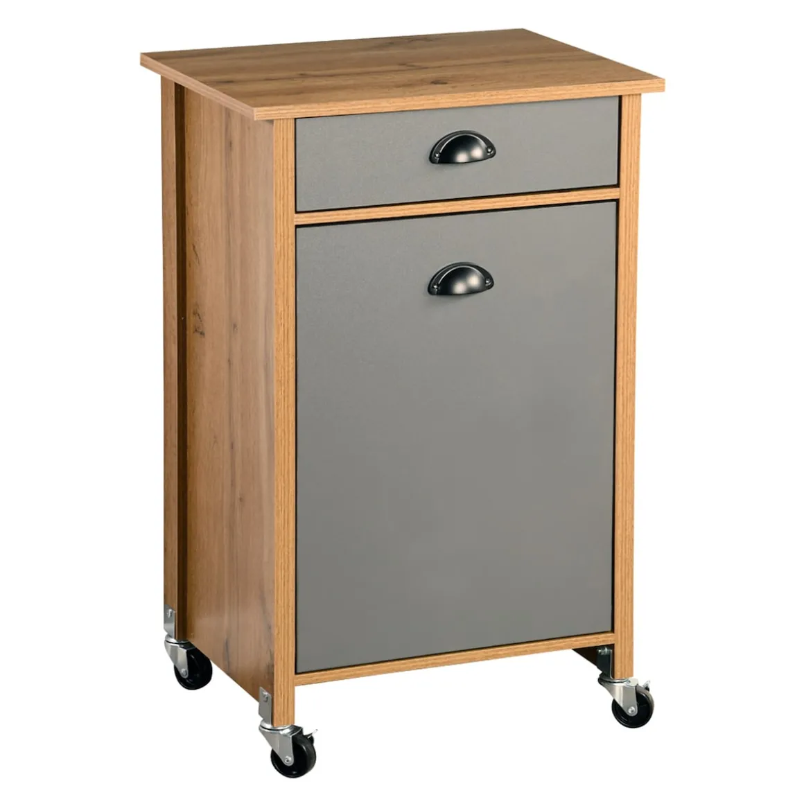 Der moderne Küchenwagen mit Mülltrennsystem schafft zusätzlichen Stauraum in der Küche. Im aufklappbaren Unterschrank befinden sich zwei herausnehmbare Abfalleimer zur Mülltrennung. Die Mülleimer besitzen ein Fassungsvermögen von je 15 Litern und sind mit Mülltütenbefestigungsringen ausgestattet. Über der Klappe ist eine Schublade angebracht, beide sind mit formschönen Metallgriffen versehen. In der zusätzlichen Aufbewahrungsmöglichkeit lassen sich Dinge wie Müllbeutel, Besteck oder andere Küchenaccessoires ordentlich und leicht zugänglich aufbewahren.