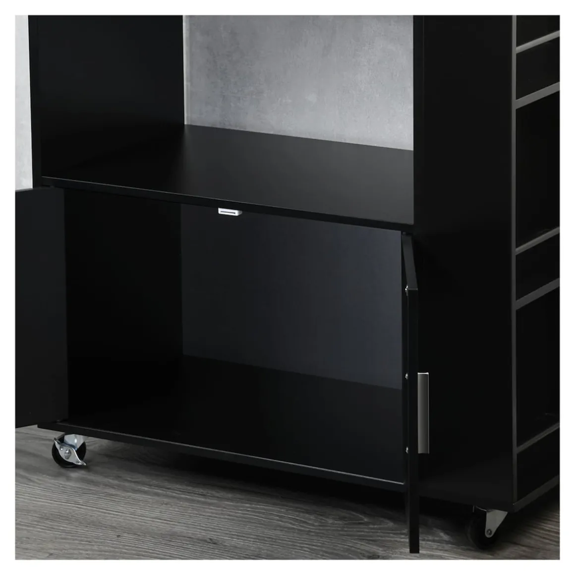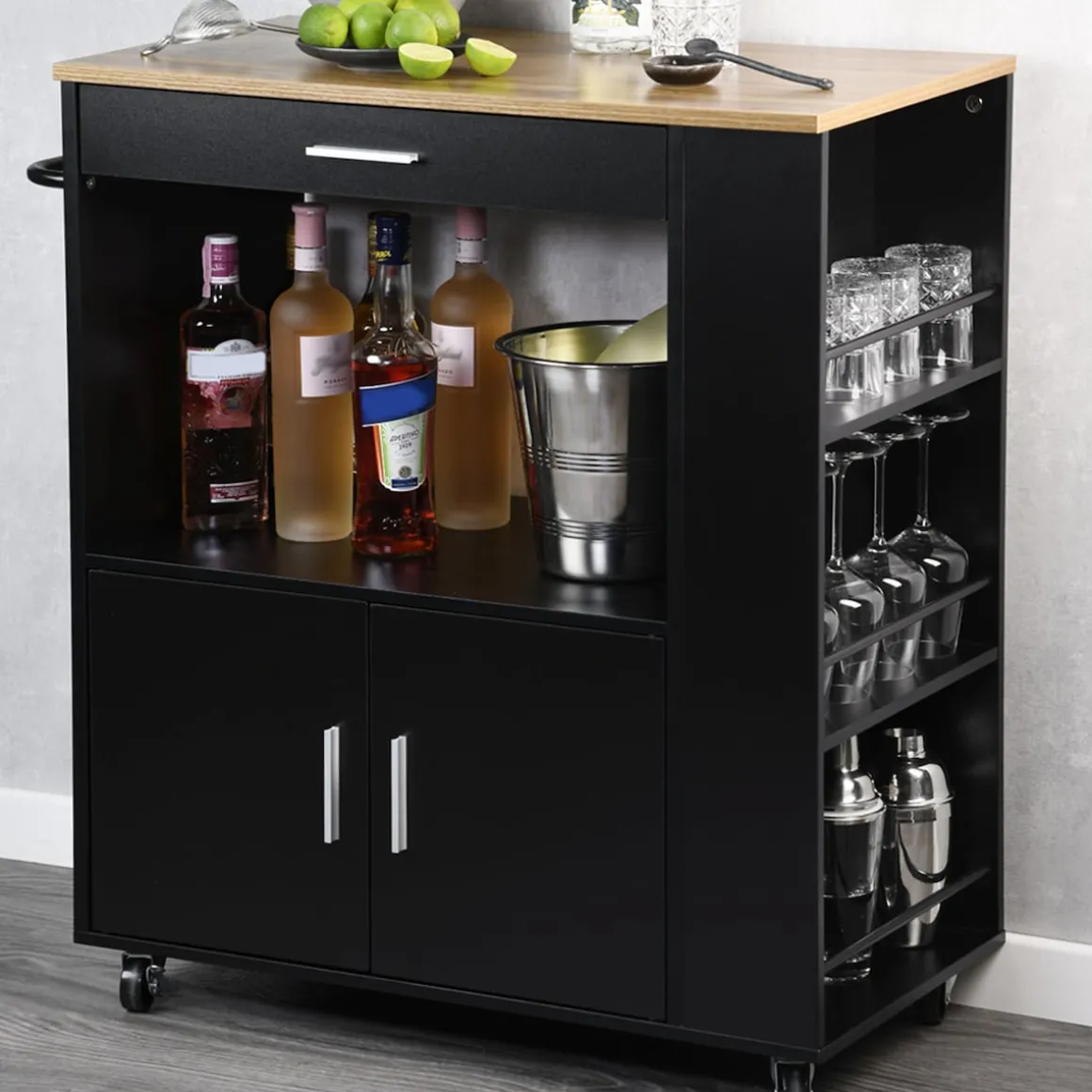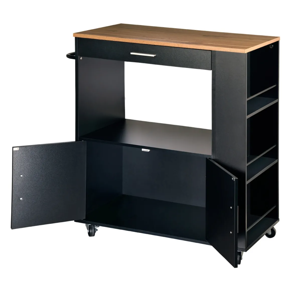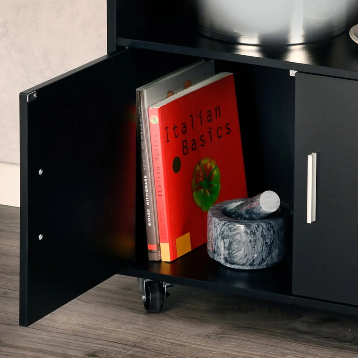 Dank der vier voll beweglichen Lenkrollen bleibt der Wagen flexibel und lässt sich mühelos dort positionieren, wo Sie ihn gerade benötigen. Zwei integrierte Feststellbremsen sorgen dafür, dass er bei Bedarf sicher an Ort und Stelle steht. Das platzsparende Design gewährt Ihnen mehr Bewegungsfreiheit, besonders in kleineren Küchen. Gleichzeitig macht die schlichte, elegante Optik den Küchenwagen zu einem stilvollen Einrichtungselement, das sich harmonisch in jedes Zuhause einfügt. Ob als mobile Arbeitsfläche, Stauraumerweiterung oder praktischer Servierwagen – dieser Küchenhelfer bietet Ihnen jederzeit die Unterstützung, die Sie brauchen.