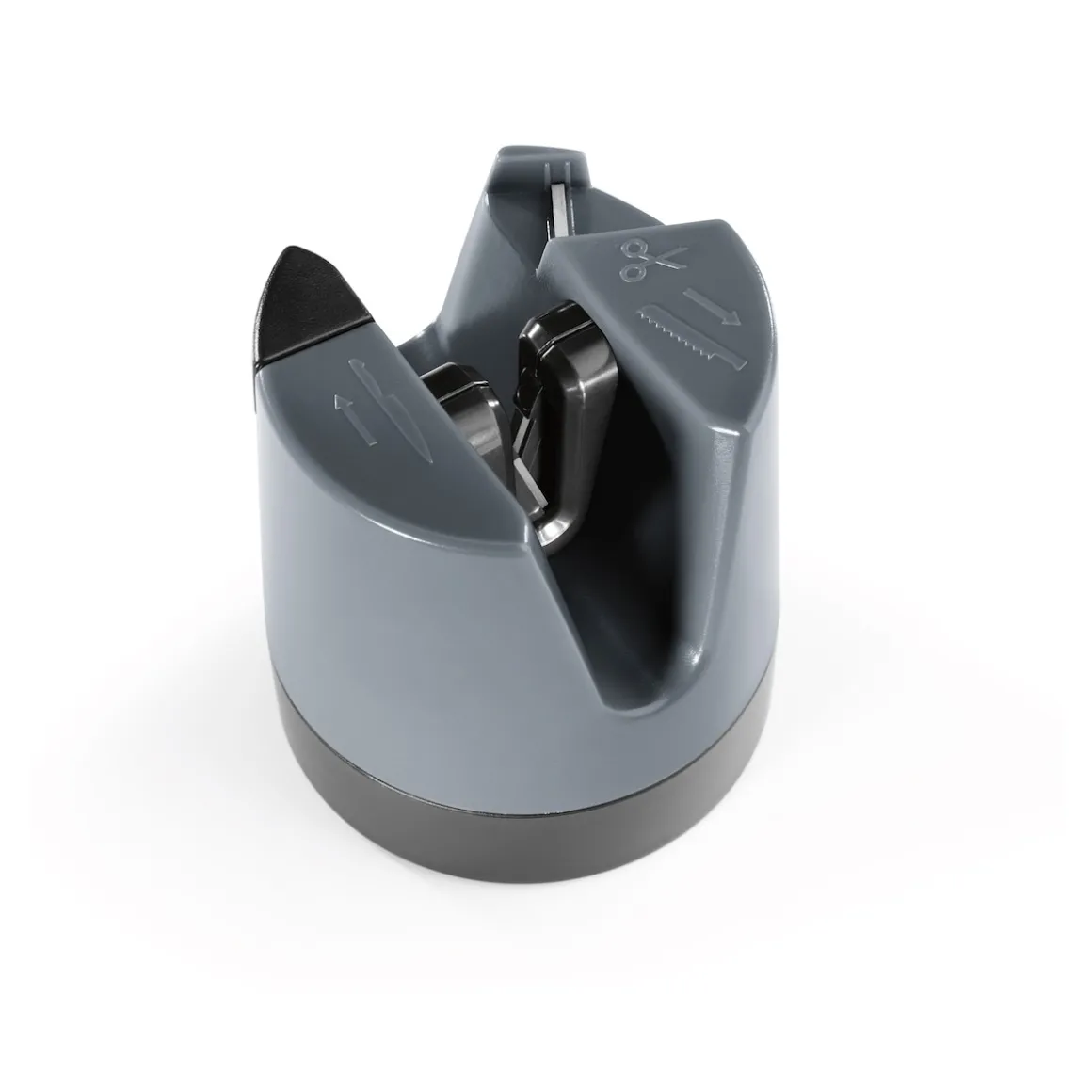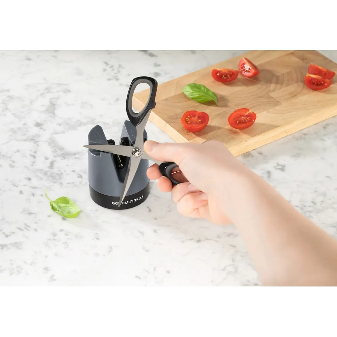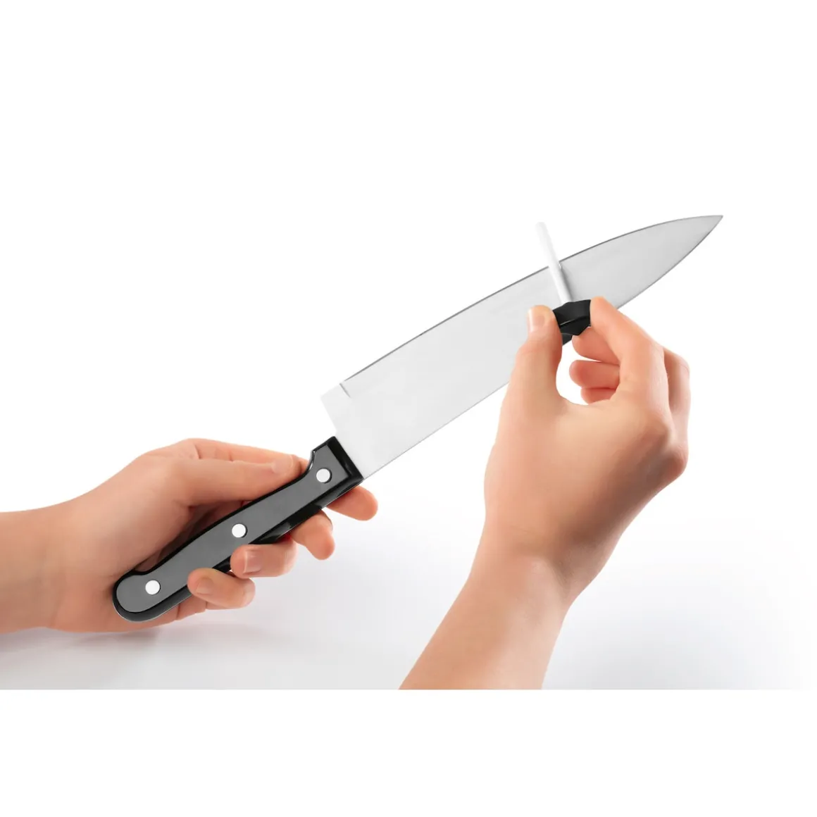 Schärfen Sie Ihre Messer und Scheren ganz bequem in Ihrer Küche. Der Messerschärfer passt für alle Klingenarten und -größen. Einfach durch die Wolfram-Schleifelemente ziehen, und der optimale Schärfwinkel stellt sich automatisch ein. Der Saugnapffuß sorgt für Stabilität. Verwenden Sie den mitgelieferten Keramik-Polierstab für den finalen Schliff. Dieser kompakte Messerschärfer findet in jeder Küche Platz und lässt stumpfe Klingen der Vergangenheit angehören. Genießen Sie wieder müheloses Schneiden.