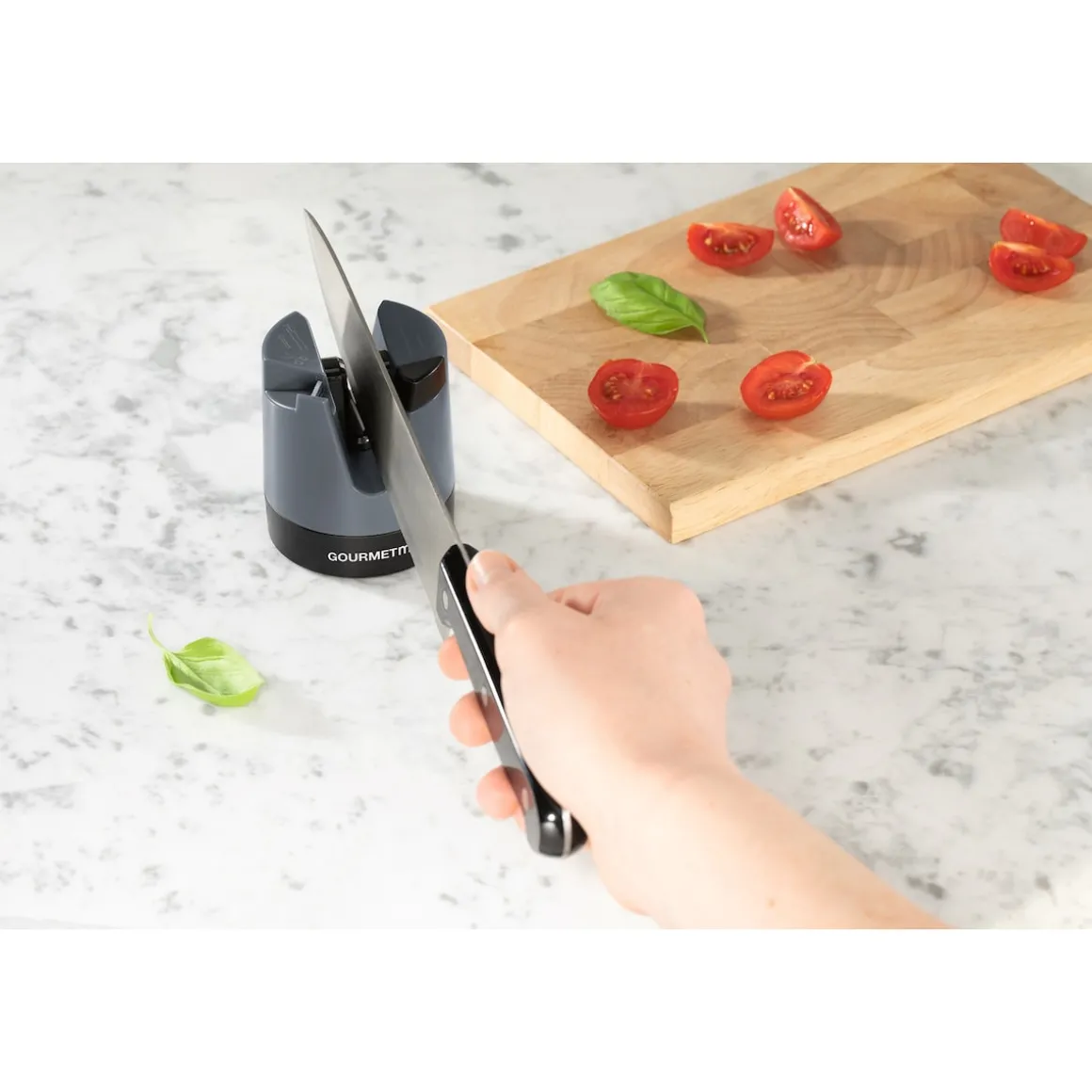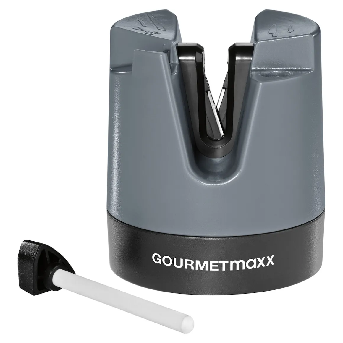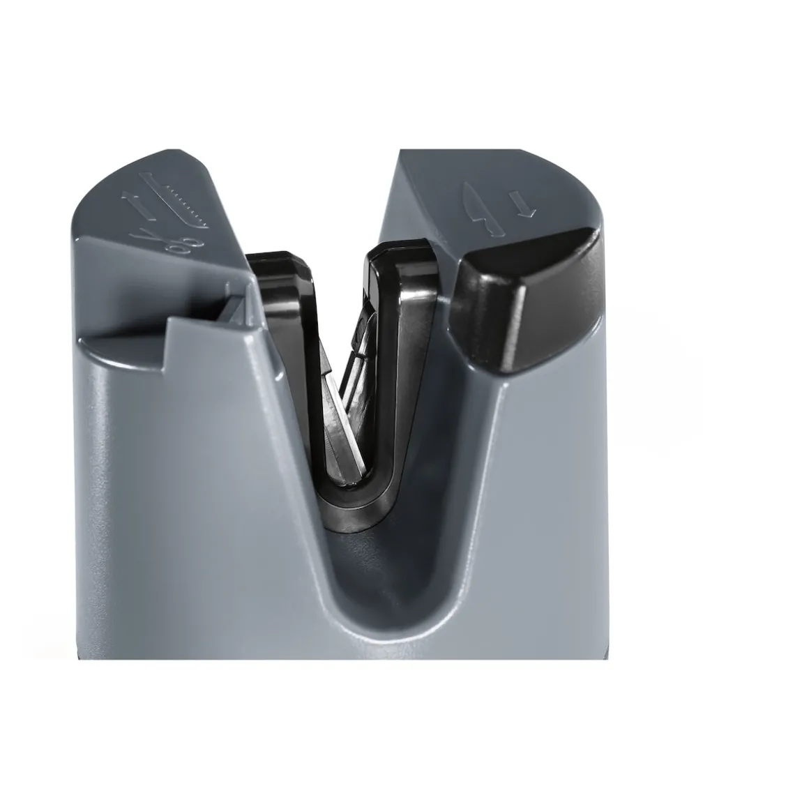 Schärfen Sie Ihre Messer und Scheren ganz bequem in Ihrer Küche. Der Messerschärfer passt für alle Klingenarten und -größen. Einfach durch die Wolfram-Schleifelemente ziehen, und der optimale Schärfwinkel stellt sich automatisch ein. Der Saugnapffuß sorgt für Stabilität. Verwenden Sie den mitgelieferten Keramik-Polierstab für den finalen Schliff. Dieser kompakte Messerschärfer findet in jeder Küche Platz und lässt stumpfe Klingen der Vergangenheit angehören. Genießen Sie wieder müheloses Schneiden.