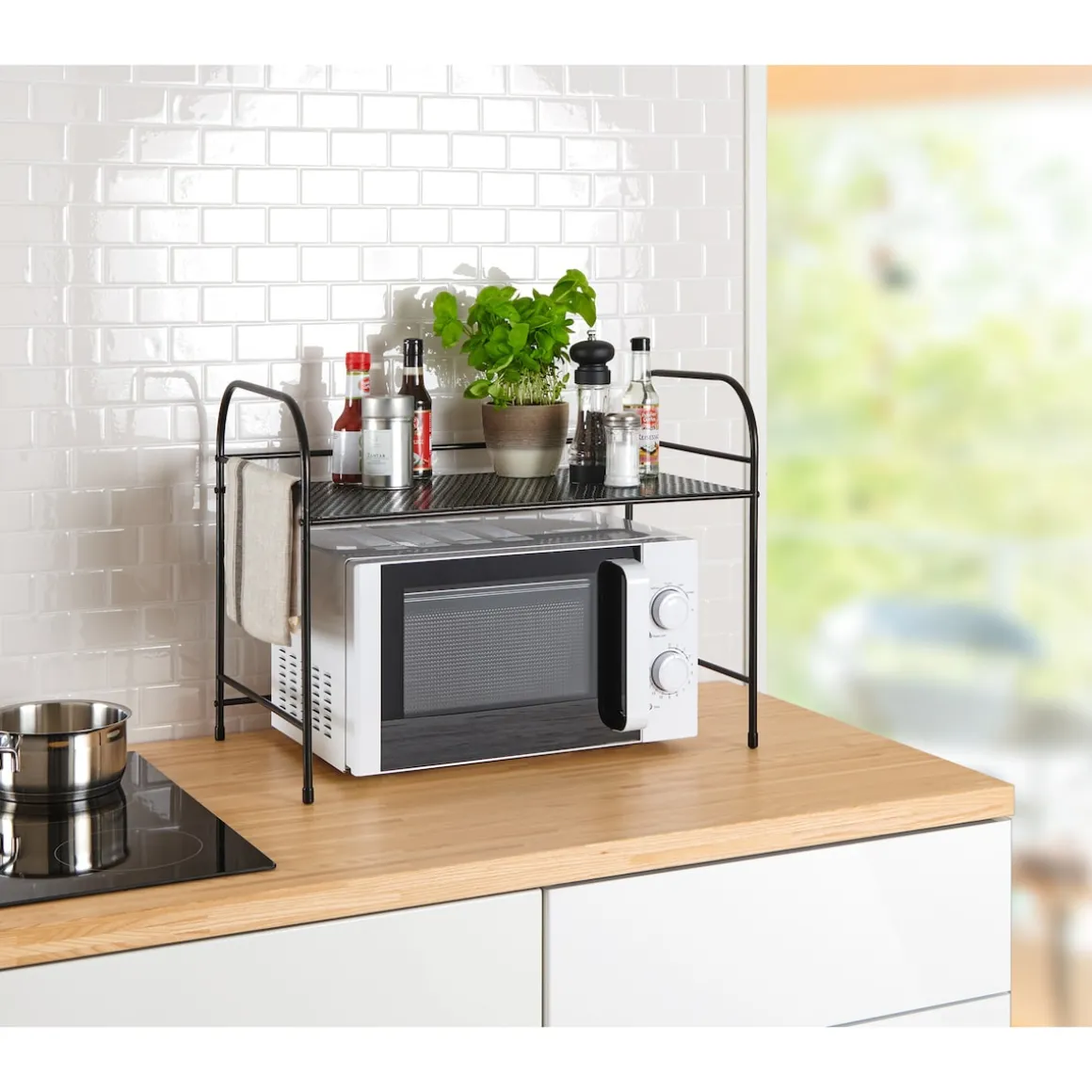 Nutzen Sie den Platz in Ihrer Küche optimal aus: Das hochwertige Metall-Regal wird einfach über die Mikrowelle gestellt und schafft wertvollen Stauraum für Kochbücher, Gewürze und Co. – so haben Sie alle wichtigen Utensilien stets griffbereit.