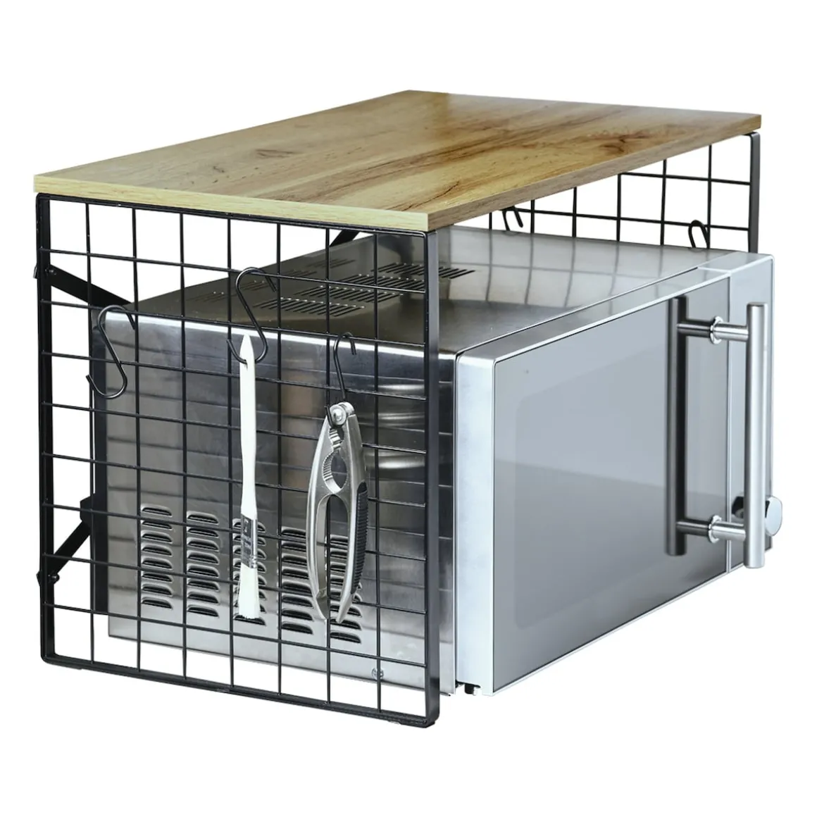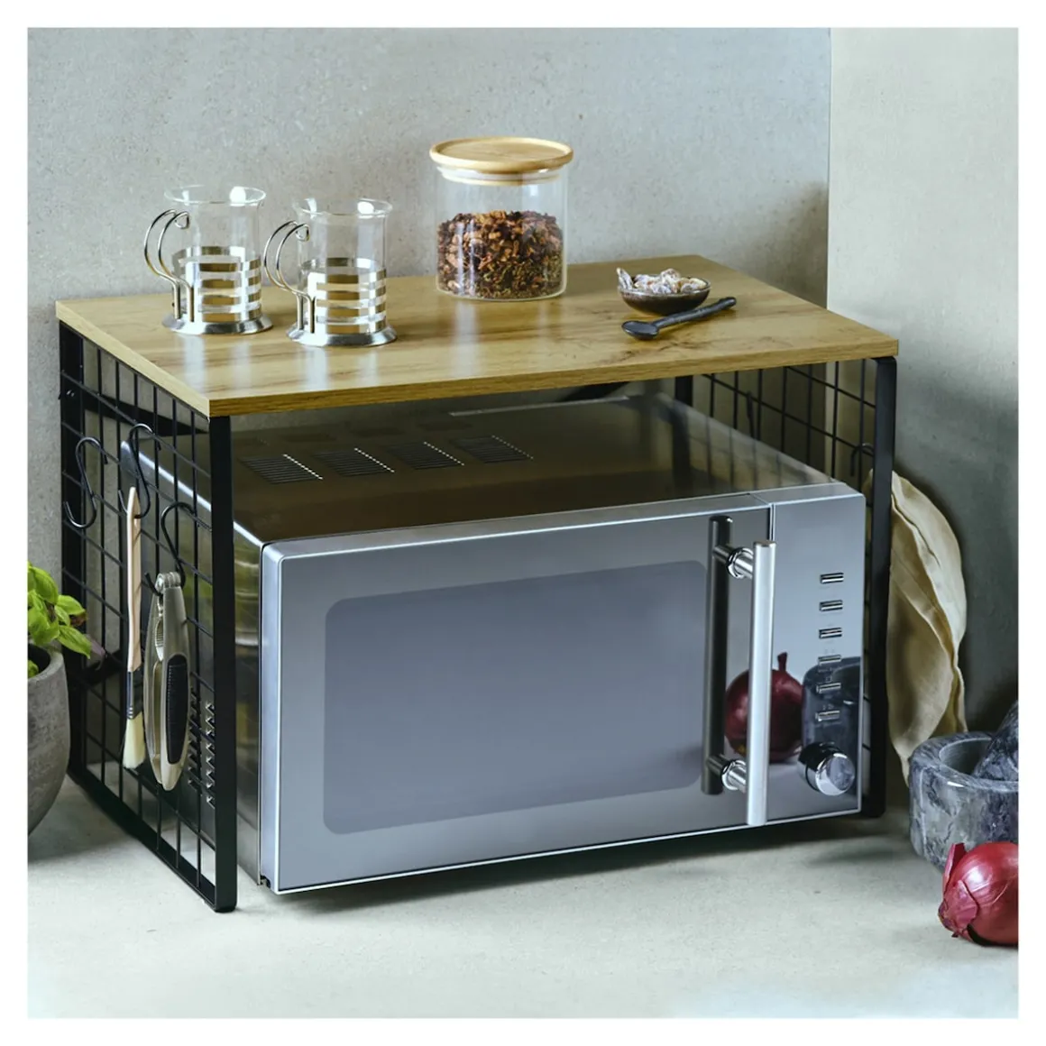 Ob beim täglichen Kochen oder beim Sonntagsbraten – in der Küche zählt jeder Handgriff. Mit diesem cleveren Regal nutzen Sie den Raum über Ihrer Mikrowelle optimal aus und bringen gleichzeitig Ordnung und Stil in Ihre Küche. Auf der großzügigen Ablage finden Gewürze, Ölflaschen oder kleine Küchenhelfer einen festen Platz. Sechs mitgelieferte Haken bieten zusätzlichen Stauraum für Handtücher, Scheren oder anderes Zubehör – immer griffbereit, immer ordentlich. Das moderne Industrial Design macht das Regal zu einem echten Hingucker, der sich flexibel auch in anderen Räumen einsetzen lässt.