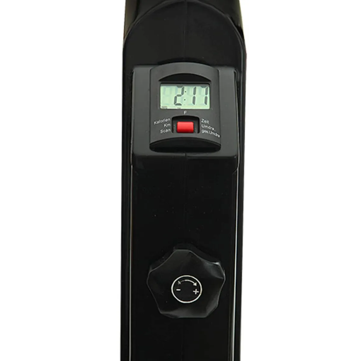 Der Widerstand ist stufenlos über die verstellbare Schleifbandbremse regulierbar und der digitale Computer zeigt Zeit, Entfernung, ca. Kalorien, Pedalumdrehungen, Pedalumdrehung total und Scan im Display an.