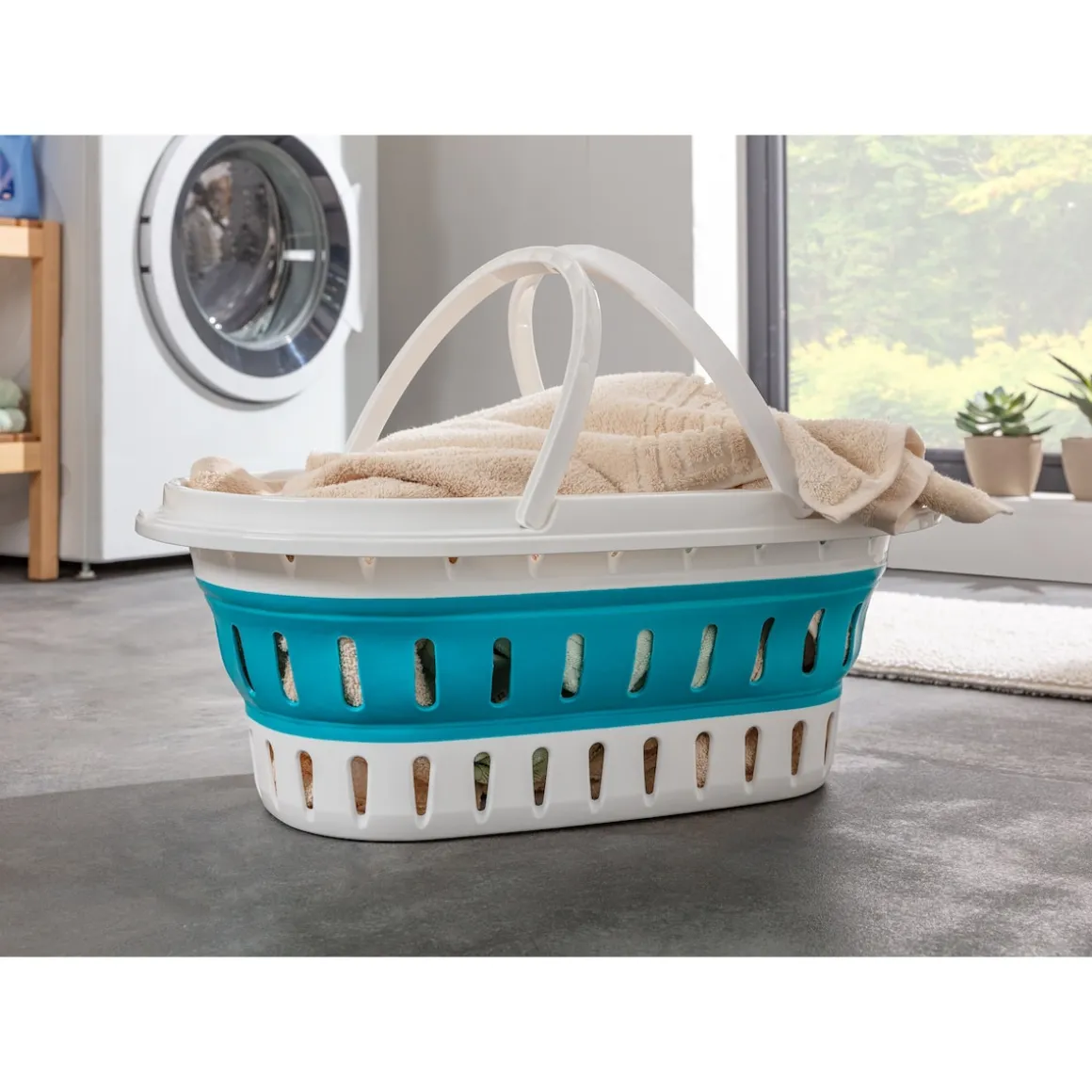 Dieser faltbare Wäschekorb ist die ideale Lösung für ein ordentliches Zuhause. Wenn er nicht gebraucht wird, lässt er sich ganz einfach zusammenfalten und platzsparend verstauen. Doch sobald es Zeit ist, Wäsche zu sammeln, ist er im Handumdrehen einsatzbereit – die praktischen Tragegriffe sorgen für einen komfortablen Transport.
