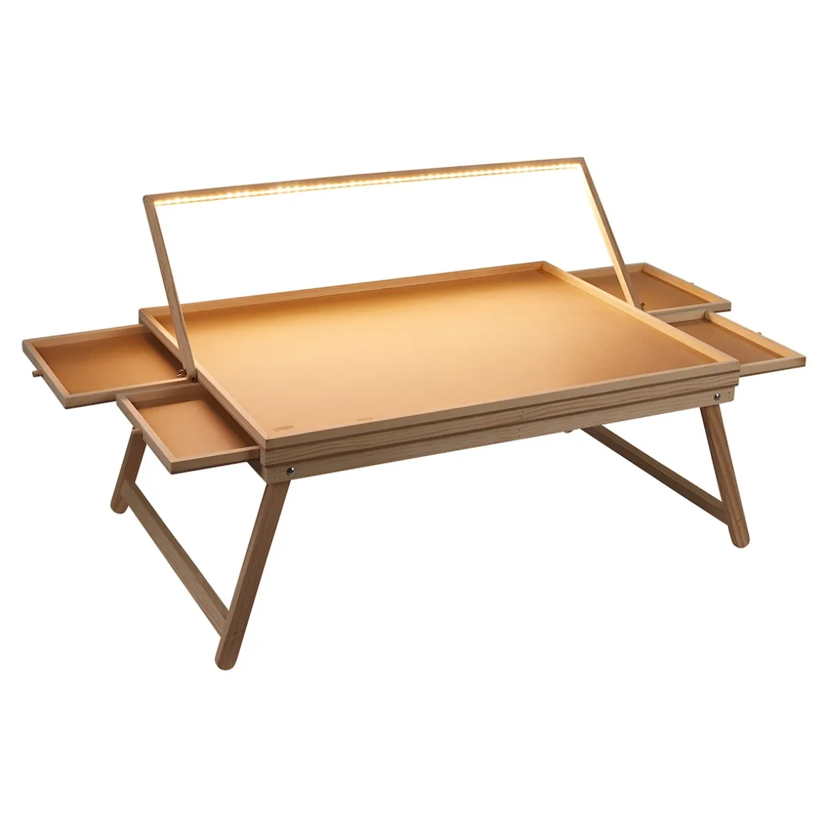 Mit dem Puzzletisch „Premium“ wird Puzzeln so komfortabel wie nie zuvor. Die klappbaren Beine machen den Tisch überall einsetzbar, egal ob Sie gemütlich auf dem Sofa, im Bett oder am Esstisch puzzeln möchten. Vier ausziehbare Schubladen bieten Ihnen die Möglichkeit, Puzzleteile übersichtlich zu sortieren und jederzeit griffbereit zu haben. Die verstellbare LED-Leiste sorgt für eine optimale Ausleuchtung, sodass Sie zu jeder Tageszeit perfekte Sicht auf Ihr Puzzle haben.