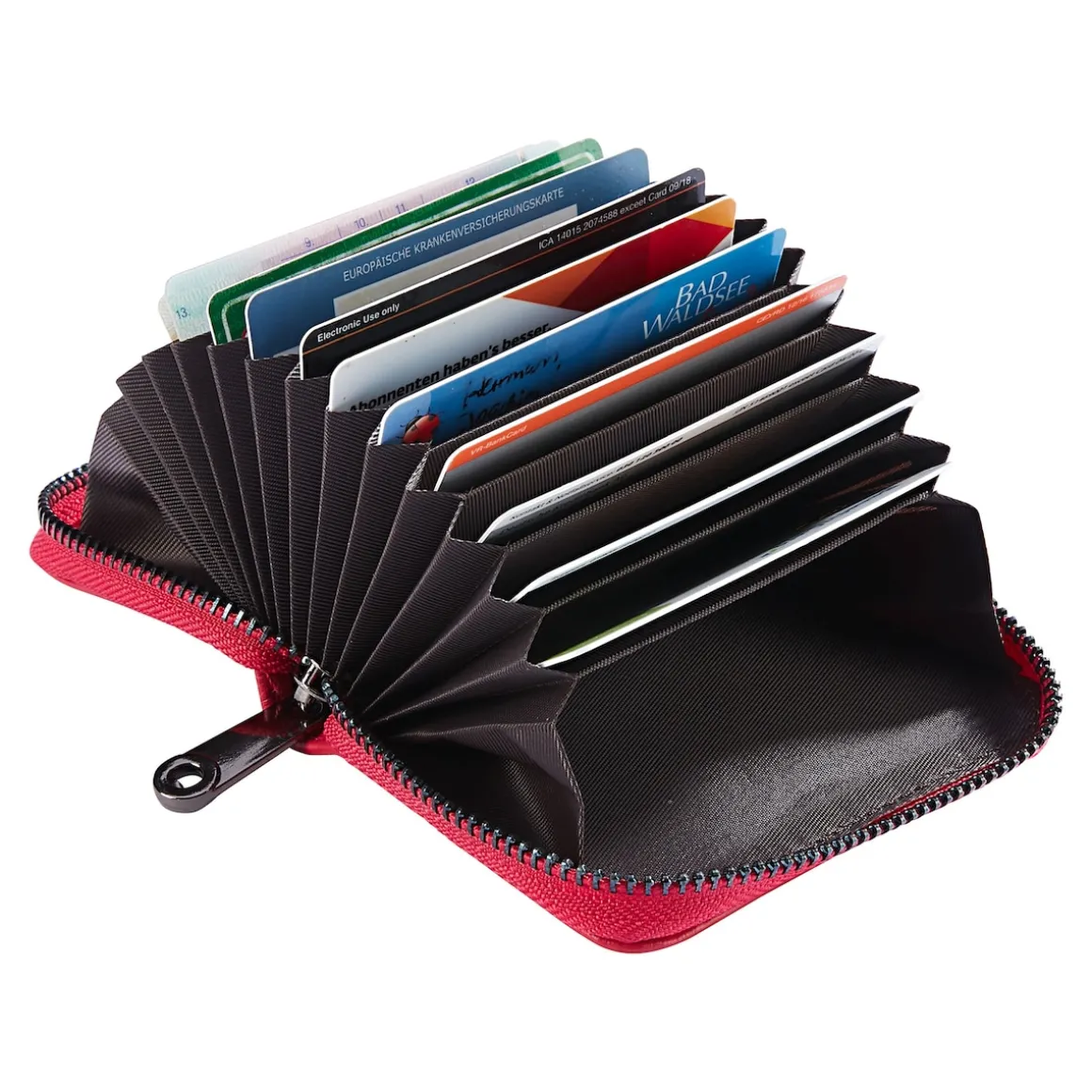 Edles Leder-Kartenetui mit extra Sicherheits-Feature! Der integrierte RFID-Scanschutz schützt Ihre Kredit- und EC-Karten vor dem illegalem Datenklau. Mit 12 Fächern für Karten und Geldscheine.