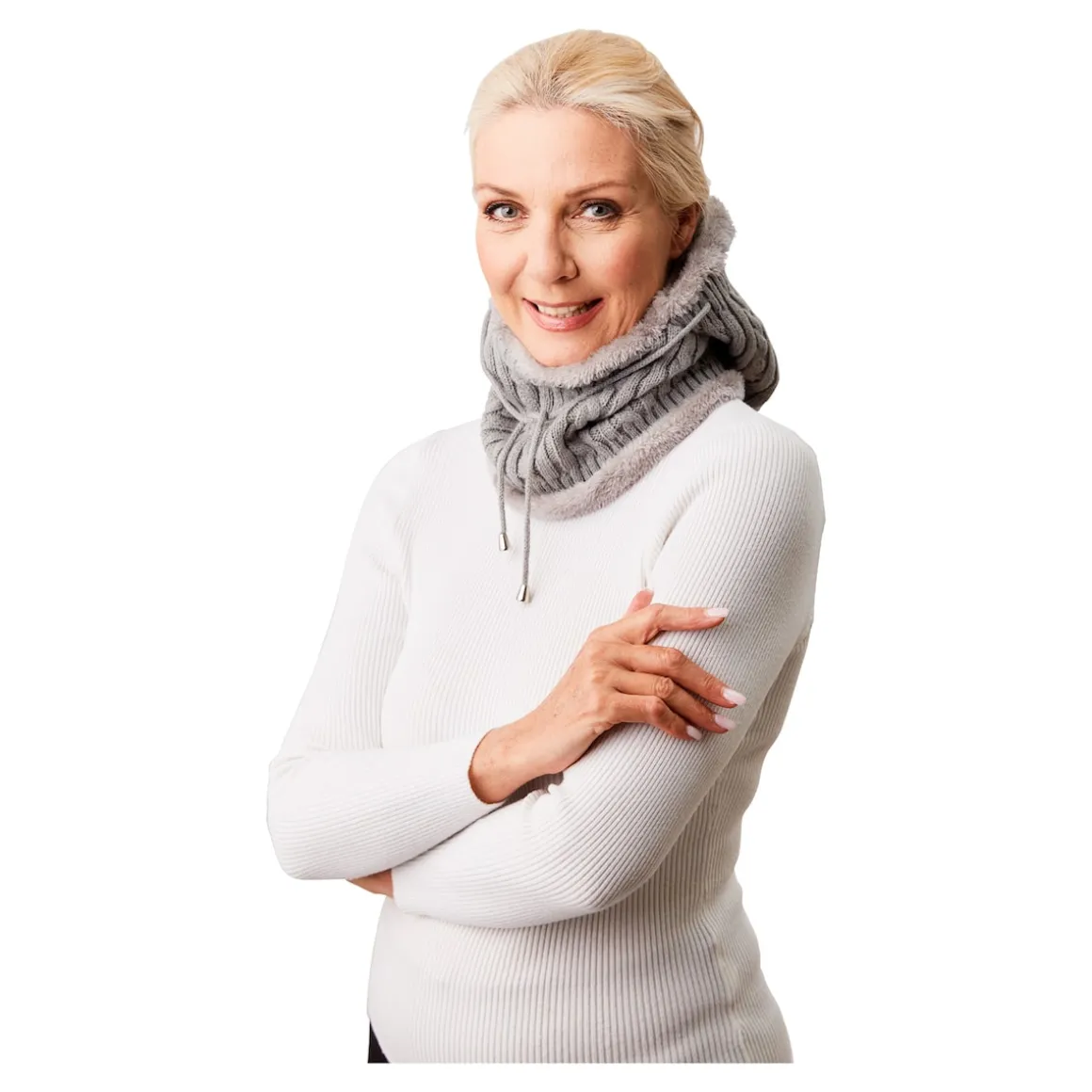 Kuschelige Wärme, die sich der Witterung anpasst: Bei Kälte ziehen Sie die flauschig gefütterte Kapuze über den Kopf und passen dank Kordelzug den kessen Kunstfellrand optimal an. Wird’s wärmer, erfreut Sie das Ensemble als Schal.