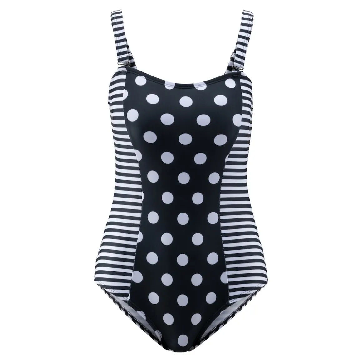 Mit den geschickt platzierten Streifen und dem figurschmeichelnden Schnitt dieses Badeanzugs zaubern Sie im Nu eine optisch schlanke Silhouette. Die individuell verstell- und abnehmbaren Träger bieten Ihnen die Flexibilität, den Badeanzug ganz nach Ihren Wünschen anzupassen.
