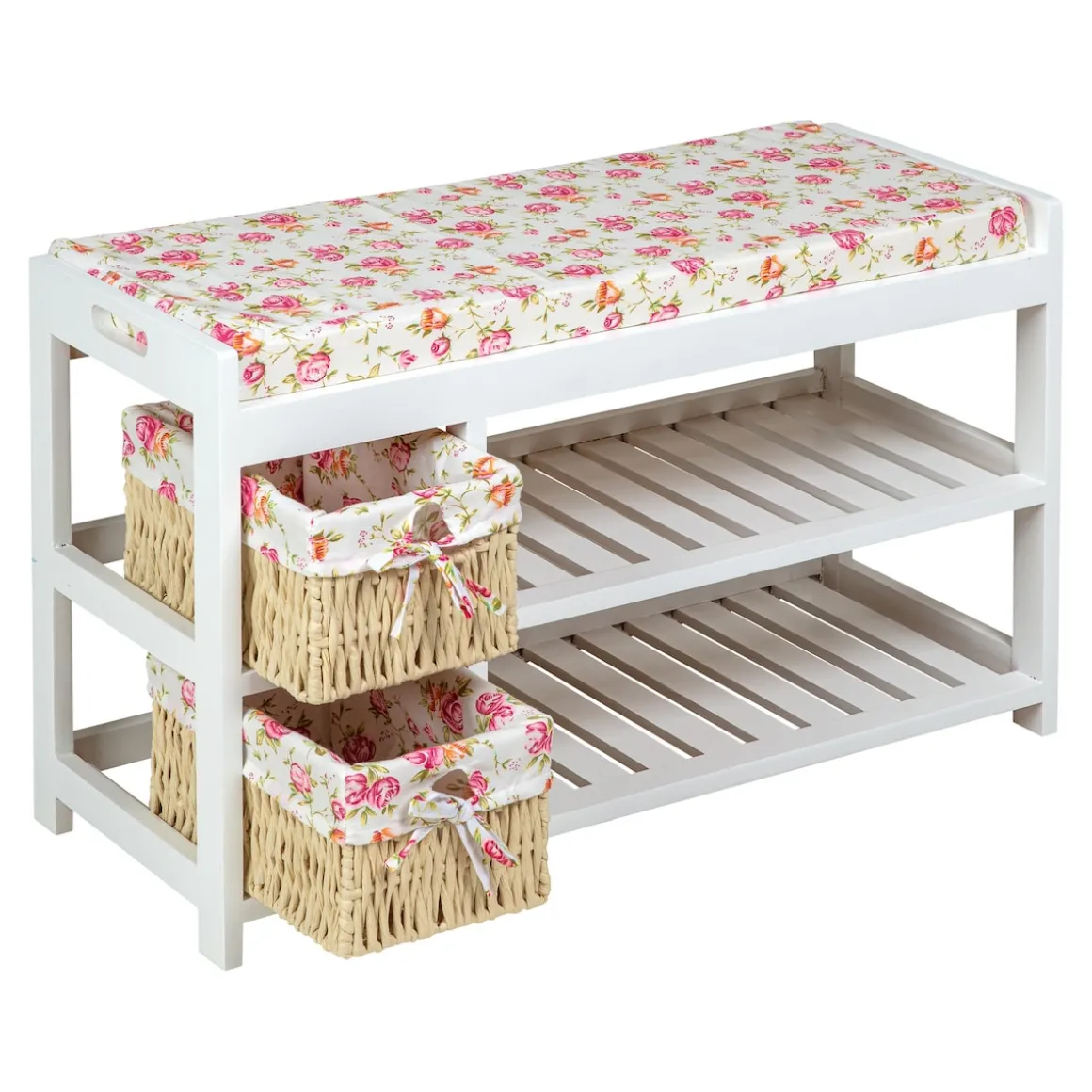 Diese Schuhbank vereint Funktionalität und romantisches Design. Mit dekorativen Rosen-Highlights bringt sie einen Hauch Nostalgie in Ihren Flur. Auf zwei Ebenen finden Ihre Schuhe stilvoll Platz. Dieses Möbelstück ist nicht nur praktisch, sondern auch ein wahrer Blickfang!