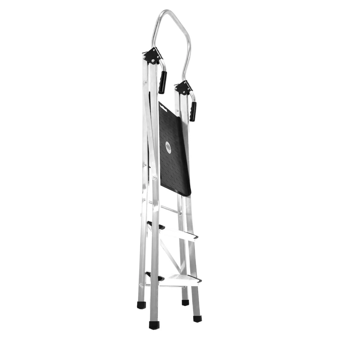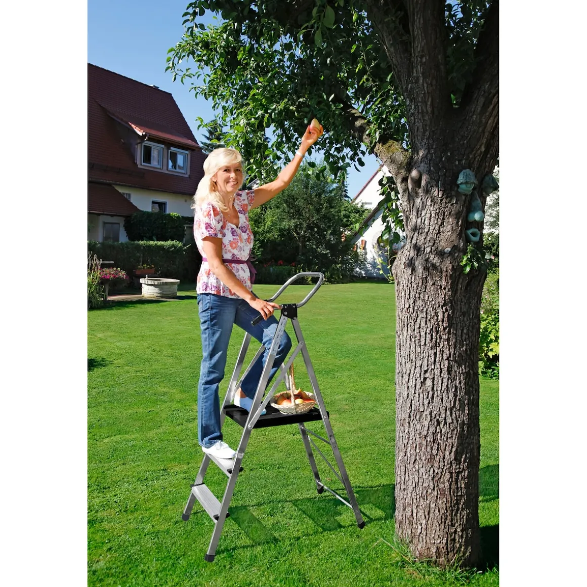 Sicherheit für drinnen und draußen! Die 3-stufige Sicherheitsleiter ist auf der höchsten Stufe mit einer großen, rutschfesten Plattform, einem Sicherheitsbügel und ergonomisch geformten Haltegriffen ausgestattet. Da kann nichts wackeln oder rutschen. Mit Klemmschutz in den Gelenken.