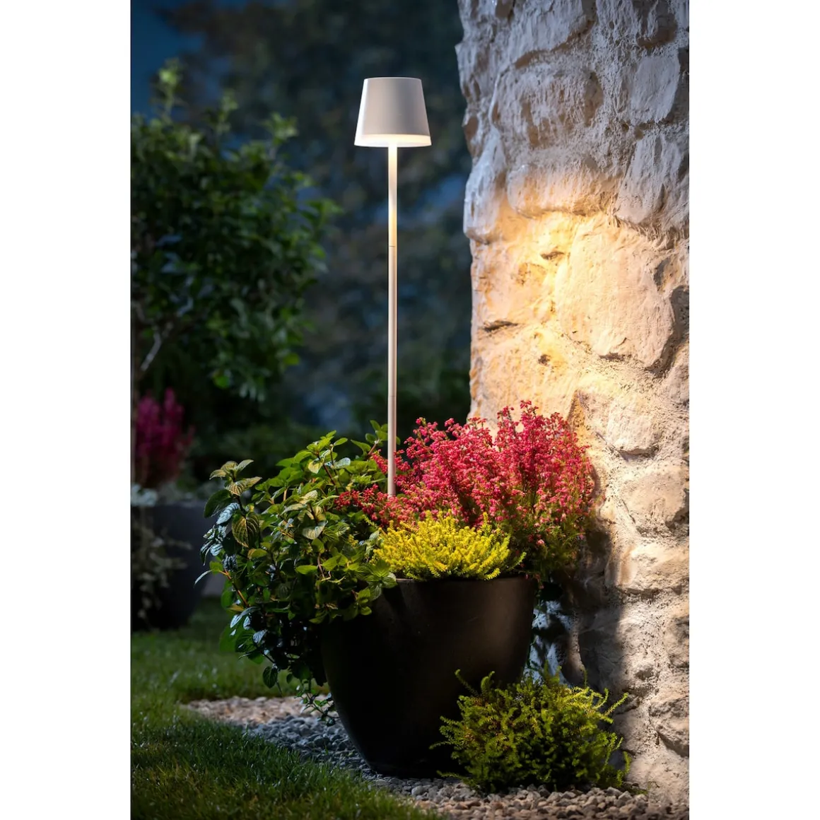 Diese Solarleuchte sorgt mit ihrem dezenten Design drinnen wie draußen für ein stilvolles Ambiente und spendet abends das tagsüber eingefangene Licht als warmweißen Schein. Dank Stecksystem lässt sie sich in der Höhe verstellen und ist sowohl auf ihrem Standfuß als auch im Beet mit Erdspieß ein Blickfang.