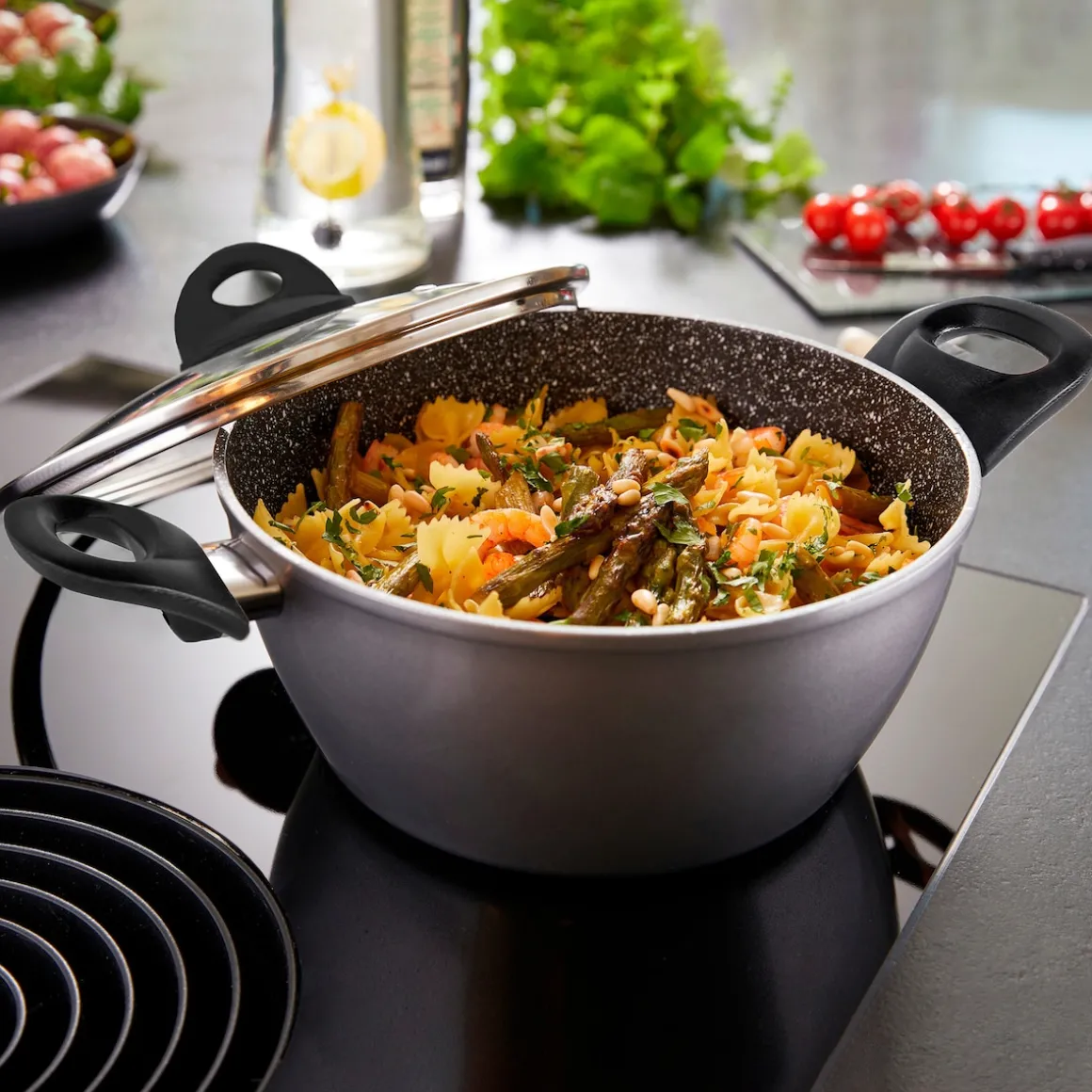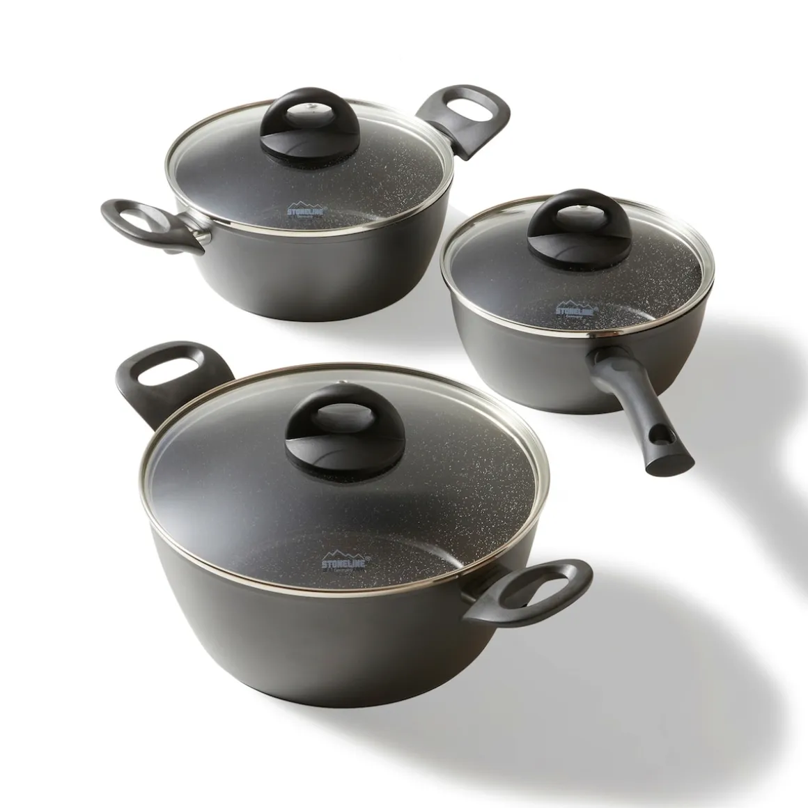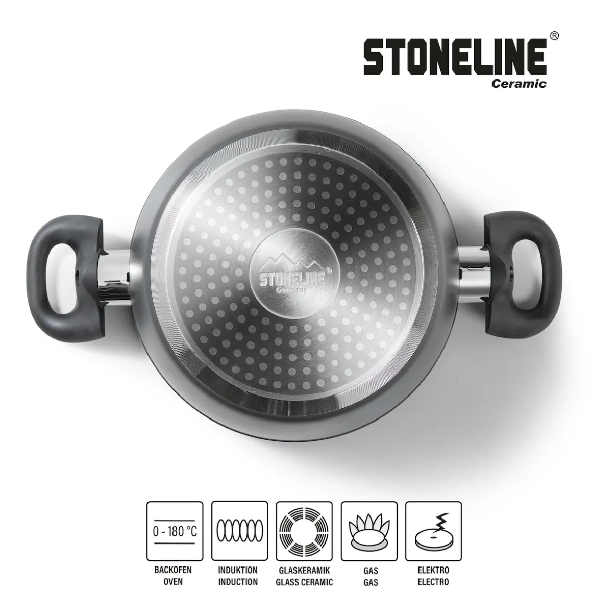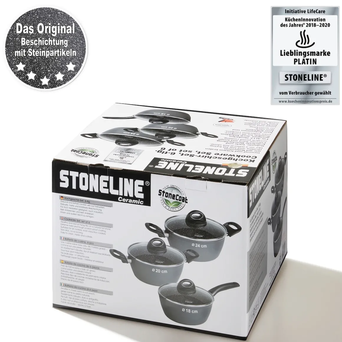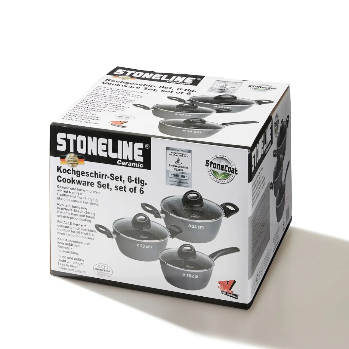 Die geniale STONELINE Beschichtung nun auch in Keramik-Ausführung!Gesundes, vitaminschonendes Kochen mit wenig Fett Für jeden Anlass das passende Kochgeschirr zur Hand – damit erleichtern Sie sich das Leben in der Küche und sorgen für ein unbegrenztes Kochvergnügen. Dank der extrem harten, langlebigen STONELINE CERAMIC Beschichtung mit Lotus Abperl-Effekt werden Sie zukünftig noch mehr Freude beim Zubereiten Ihrer Speisen haben! Hierbei spielt es keine Rolle, ob Sie auf Glaskeramik, Induktion, Elektro oder Gas kochen. Dieses 6-teilige Set besteht aus: 1 Stielkassarolle, ø ca. 18 cm, Höhe: ca. 7,5 cm, ca. 1,8 l1 Kochtopf, ø ca. 20 cm, Höhe: ca. 8,5 cm, ca. 2,6 l1 Kochtopf, ø ca. 24 cm, Höhe: ca. 11 cm, ca. 4,2 l1 Glasdeckel, ø ca. 18 cm1 Glasdeckel, ø ca. 20 cm1 Glasdeckel, ø ca. 24 cm Die wichtigsten Vorteile des STONELINE CERAMIC Kochgeschirrs auf einen Blick: Kratzfeste STONELINE- Keramikbeschichtung Optimales Bratergebnis und kross gebratenes Fleisch Bester Geschmack Vitaminschonend kochen und braten mit wenig Fett und Öl Kein Anbrennen und kein Ankleben Super leicht zu reinigen Für alle Herdarten geeignet, auch Induktion Extra starker, verzugsfreier Boden Beschichtung hitzebeständig bis 450 °C Zum Flambieren geeignet Bodenstärke: 3 mm Backofengeeignet bis 180 °C Material: AluminiumPFAS frei Reinigungs- und Pflegetipps: Vor dem ersten Gebrauch empfehlen wir, Ihr Koch- oder Backgeschirr mit etwas Wasser und einem milden Spülmittel gründlich auszuwaschen.Verteilen Sie anschließend mit einem Papierküchentuch einige Tropfen Speiseöl auf der Beschichtung.Dank dem Easy-Clean-Effekt wird die Reinigung per Hand empfohlen. Einfach mit heißem Wasser, Handspülmittel und einem weichen Schwamm auswischen.