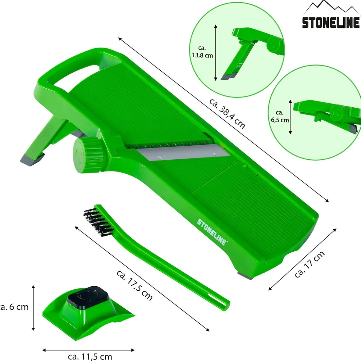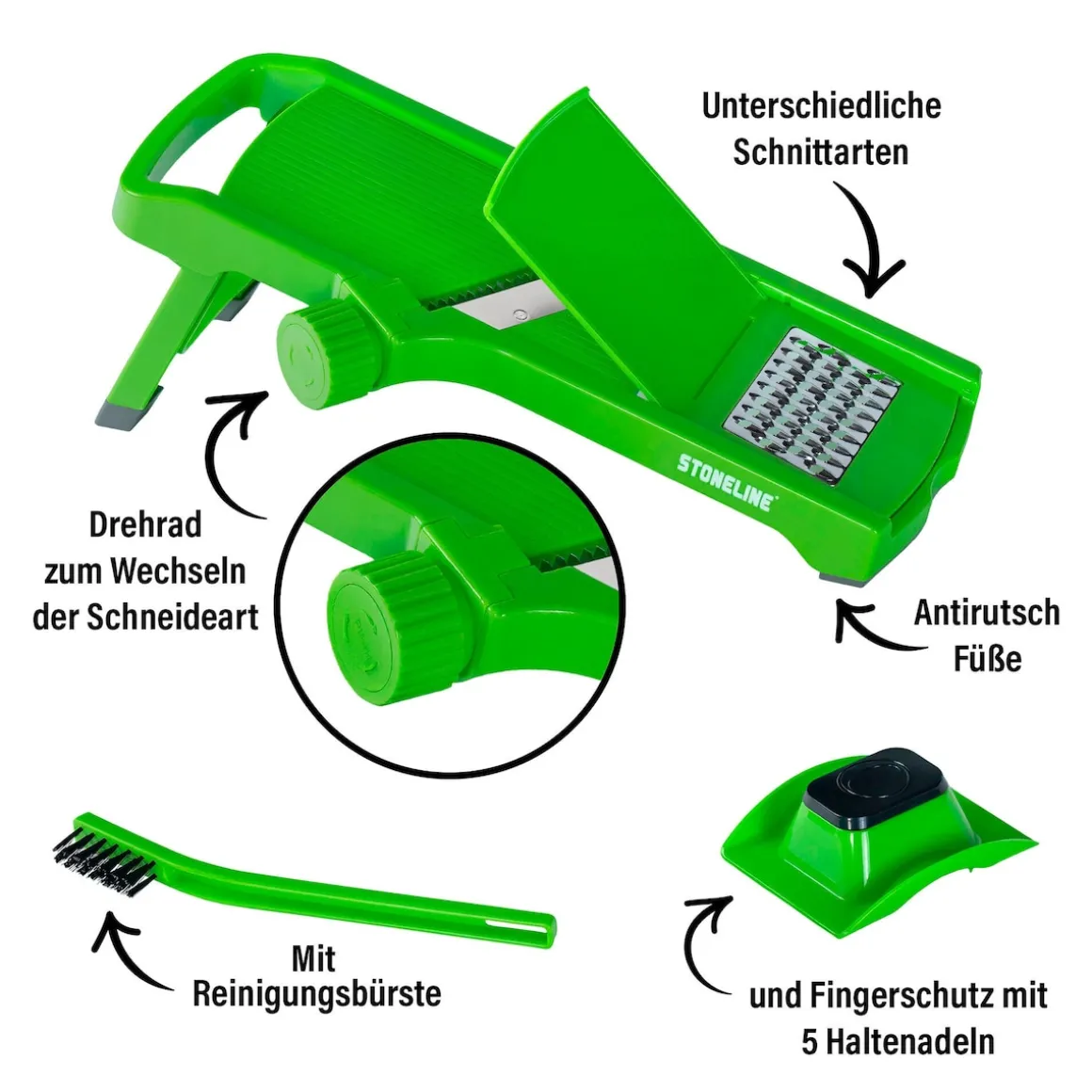 STONELINE – Das Original! Dieser vielseitige STONELINE Gemüseschneider mit sechs verschiedenen Schneidarten sollte in keiner Küche fehlen! Er ist ideal, um Kartoffeln, Kraut, Äpfel, Zwiebeln, Gurken, Möhren, Paprika und vieles mehr ganz leicht und gleichmäßig zu zerteilen. Die Edelstahlklingen mit mikrofeinem Schliff sorgen für ein sauberes und präzises Schneidergebnis. Mithilfe des seitlichen Drehrads kann die gewünschte Schneidart ausgewählt werden: dünne Scheiben mittlere Scheiben Dicke Scheiben Feine Streifen Stifte Zusätzlich besitzt der Gemüsehobel eine Reibe. Auf dieser separaten Fläche kannst du Lebensmittel in dünne Raspel zerkleinern. Der vielseitige Küchenhelfer ist einfach und platzsparend zu verstauen, da der Fuß klappbar und der Hobel damit vielseitig einsetzbar ist: bei ausgeklapptem Fuß zum Hobeln auf einer ebenen Fläche bei eingeklapptem Fuß zum Hobel auf einer Schüssel Für ein sicheres Schneiden ist der V Hobel mit Füßen aus rutschhemmendem Material ausgestattet. Der Fingerschutz-Halter sorgt für einen festen Halt des Schnittguts und ermöglicht das Verarbeiten von Obst und Gemüse bis auf einen minimalen Rest. Mit der mitgelieferten Reinigungsbürste kannst du den Gemüsehobel einfach unter fließendem Wasser abspülen und Speisereste aus dem herausnehmbaren Schneideinsatz und der Reibe entfernen. Dieses Set besteht aus:1 Gemüseschneider mit 5 verschiedenen Klingen und 1 separater Reibfläche 1 Fingerschutz-Halter 1 ReinigungsbürsteIn der Farbe: Grün Die wichtigsten Vorteile auf einen Blick: Vielseitig verwendbarer Hobel mit Drehrad zum Wechseln zwischen 5 verschiedenen Schneidarten Mit separater Reibfläche Ideal zum Zerkleinern von Obst, Gemüse, Käse u. v. m. Mikrofein geschliffene Klingen für einen präzisen und schnellen Schnitt Extra sicher dank Fingerschutz-Halter und rutschfestem Fuß Material Klingen: rostfreier Edelstahl