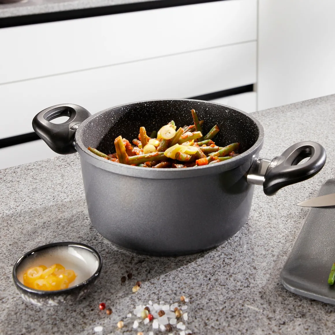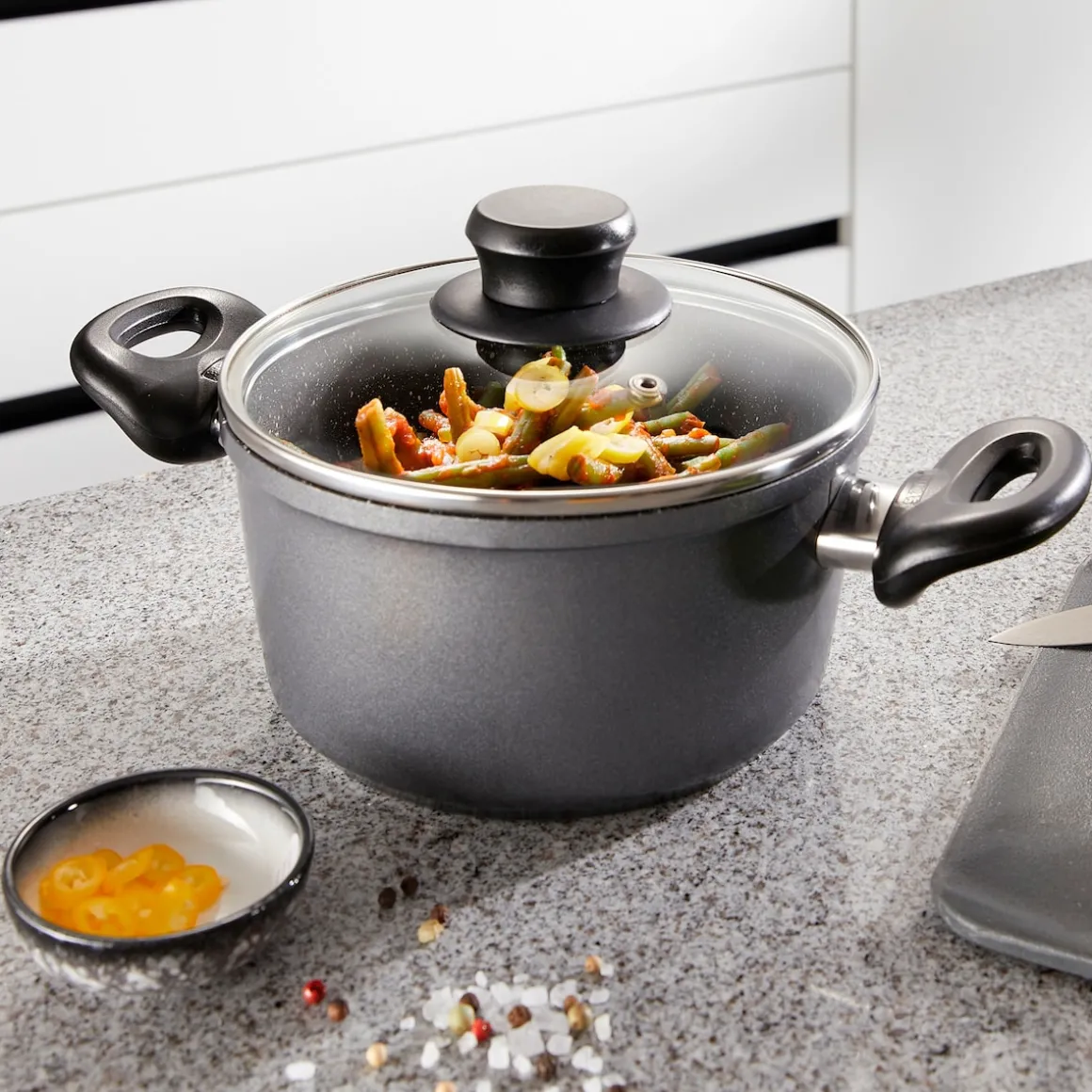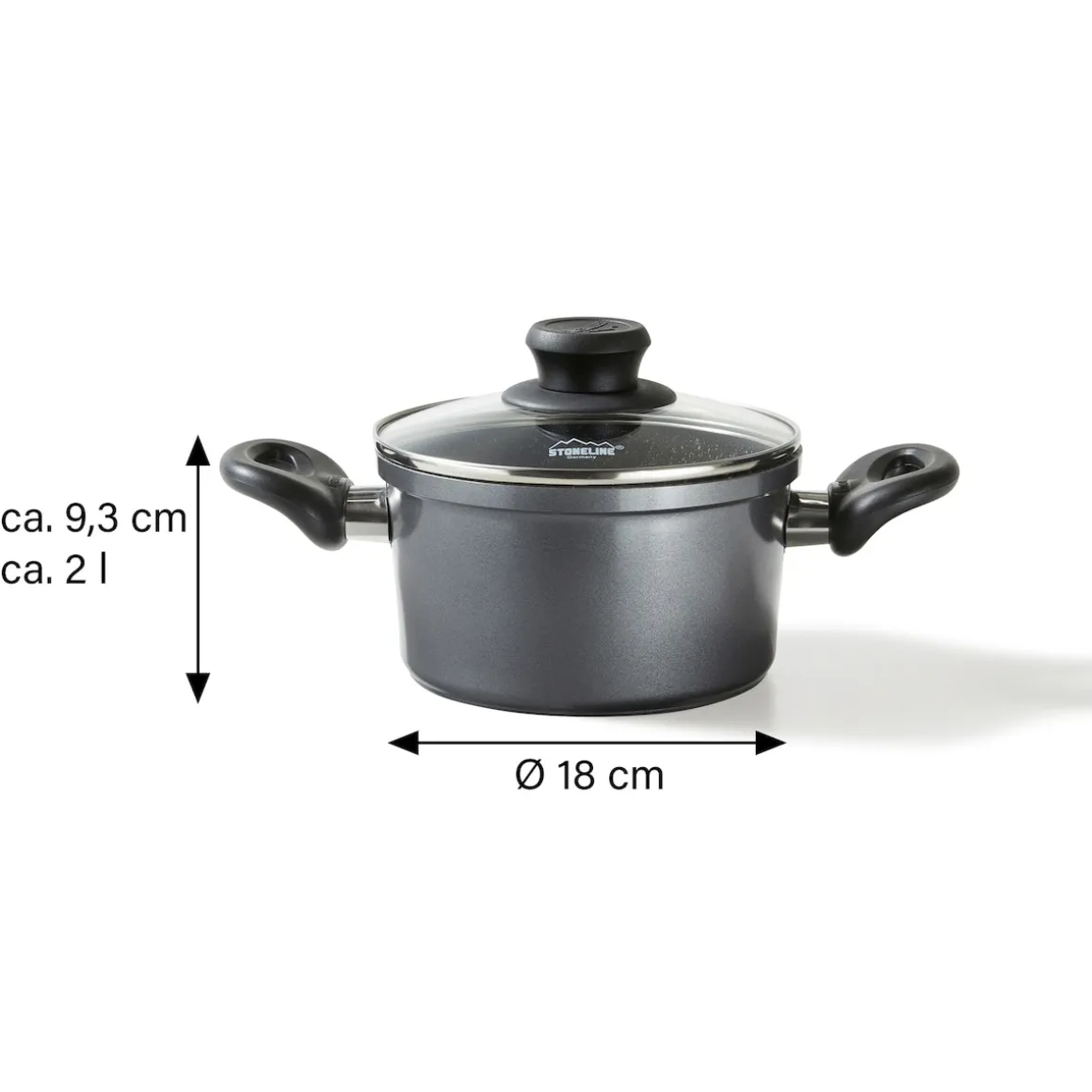 STONELINE – Das Original!Gesund fettfrei kochen und braten! Ein Kochtopf dieser Größe gehört zur Grundausstattung in jeder Küche. Dank der speziellen STONELINE-Antihaftbeschichtung lassen sich Ihre Speisen – je nach Wunsch – mit oder ohne Bratfett und Ol zubereiten und ganz ohne Ankleben aus dem Kochgeschirr lösen. Hierbei spielt es keine Rolle, ob Sie auf Glaskeramik, Induktion, Elektro oder Gas kochen. In Kochgeschirr mit der original STONELINE-Beschichtung bleiben keine hartnäckigen Reste haften und die einfache Handwäsche spart Ihnen Zeit und Mühe. 1 Kochtopf, ø ca. 18 cm, Höhe: ca. 9,3 cm, ca. 1,8 l1 Glasdeckel, ø ca. 18 cm Die wichtigsten Vorteile des STONELINE Kochgeschirrs auf einen Blick: Weltweit einzige Antihaftbeschichtung mit echten Steinpartikeln Kratzfeste STONELINE-Antihaftbeschichtung Vitaminschonend kochen und braten ohne Fett und Ol Optimales Bratergebnis und kross gebratenes Fleisch Auch für Vegetarier geeignet: Gemüse bleibt knackig und saftig Kein Anbrennen und kein Ankleben Super leicht zu reinigen Extra starker, verzugfreier Boden Bodenstärke: 4,5 mm Für alle Herdarten geeignet, auch Induktion Backofengeeignet bis 180 °C Material: Aluminiumguss Reinigungs- und Pflegetipps: Vor dem ersten Gebrauch empfehlen wir, Ihr Koch- oder Backgeschirr mit etwas Wasser und einem milden Spülmittel gründlich auszuwaschen.Verteilen Sie anschließend mit einem Papierküchentuch einige Tropfen Speiseöl auf der Beschichtung.Bei der weiteren Nutzung können Sie auf den Einsatz von Fett oder Ol verzichten!Dank dem Easy-Clean-Effekt wird die Reinigung per Hand empfohlen. Einfach mit heißem Wasser, Handspülmittel und einem weichen Schwamm auswischen.