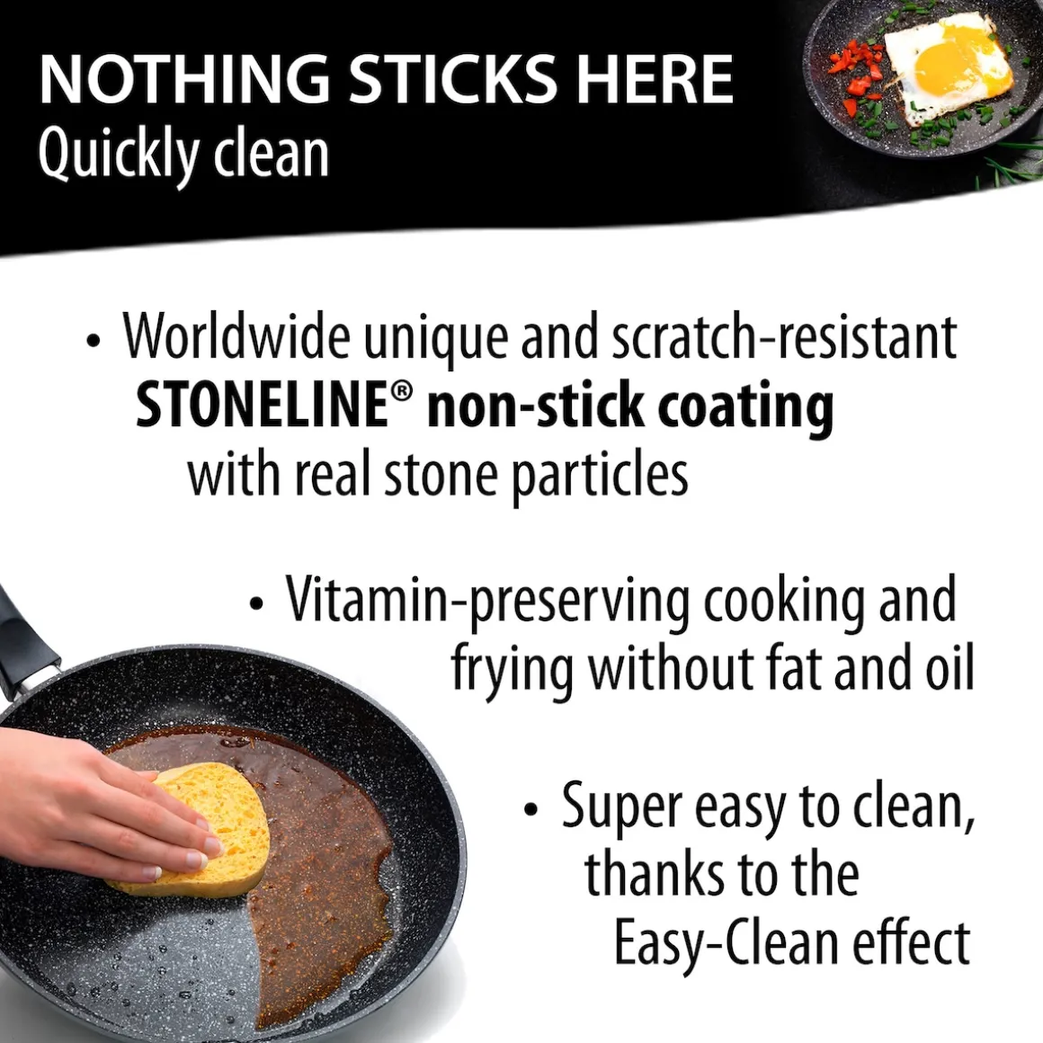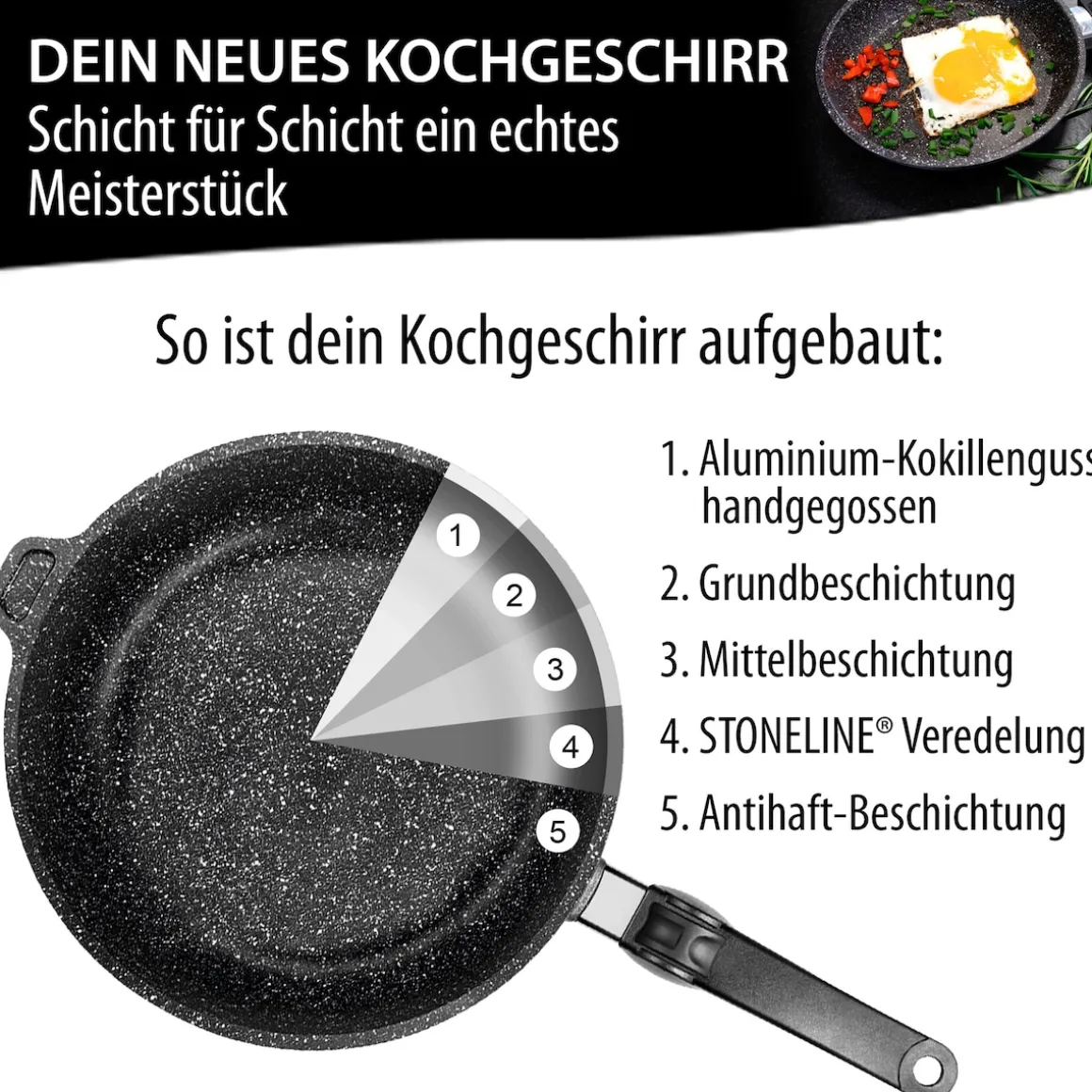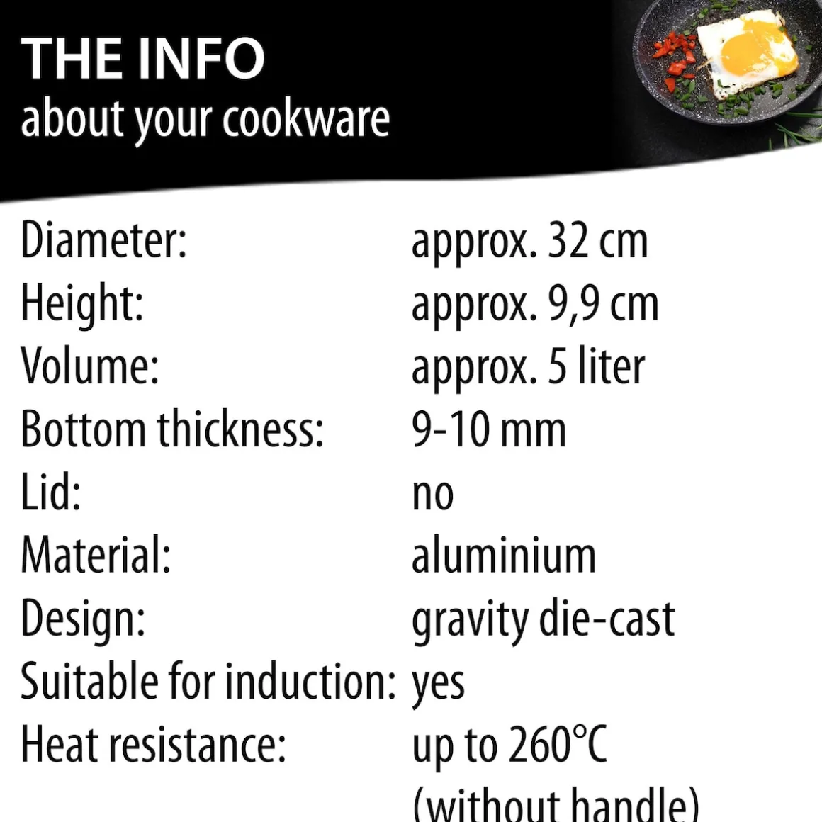 STONELINE Made in Germany! Gesund fettfrei kochen und braten! Das Qualitätsmerkmal „Hergestellt in Deutschland“ spricht bei diesem von Meisterhand gegossenen Kochgeschirr für sich. Dank des Aluminium-Kokillengusses bleibt das Kochgeschirr spannungsfrei und verzieht sich auch bei sehr hohen Temperaturen nicht. Der extra starke Boden liegt optimal auf dem Kochfeld auf, um die Hitze direkt aufzunehmen und gleichmäßig zu verteilen. Dadurch ist ein sehr energieeffizientes Kochen gewährleistet. Ihre Gerichte werden schonend zubereitet, Vitamine und Mineralien bleiben weitestgehend erhalten. Dank der sehr guten Wärmeleitfähigkeit ist das Kochgeschirr hervorragend zum Braten, Dünsten, Schmoren und Dämpfen geeignet. Nimmt man die Griffe ab, passt das Kochgeschirr auch prima in den Kühlschrank und ist sehr viel leichter und platzsparender zu verstauen. Dank unserer einzigartigen Original STONELINE-Antihaftbeschichtung lassen sich Ihre Speisen – je nach Wunsch – mit oder ohne Bratfett und Öl zubereiten und ganz ohne Ankleben aus dem Kochgeschirr lösen. Spitzenprodukt deutscher Wertarbeit: Die einzigartigen Pfannen von STONELINE stehen für Funktionalität und Qualität auf höchstem Niveau! Stück für Stück von Hand gegossen. 1 Handguss Wok, ø ca. 32 cm, Höhe: ca. 9,9 cm, ca. 5,3 l Körper aus Aluminium-Kokillenguss Stück für Stück handgegossen Hergestellt aus edelsten Rohmaterialien Spannungsfreies Gussverfahren Induktionsboden mit Kaltgasverfahren CSi (Cold Spray induction) Technologie Hervorragende Wärmeleitfähigkeit und gleichmäßige Hitzeverteilung Schnelleres Erhitzen dank modernem Kaltgasverfahren Extra starker, verzugsfreier Boden 9 – 10 mm Original STONELINE Antihaft-Beschichtung Weltweit einzigartige und kratzfeste STONELINE Antihaftbeschichtung mit echten Steinpartikeln Vitaminschonend kochen und braten ohne Fett und Öl Kein Anbrennen und kein Ankleben Verstärkter Schüttrand Einfaches und tropffreies Ausgießen Höhere Stoßfestigkeit Abnehmbare Griffe Ideal für den Einsatz im Backofen Kochgeschirr platzsparend verstaubar Sicher durch stabile Befestigung Einfache Handhabung Geeignet zum Braten, Dünsten, Schmoren, Dämpfen & Überbacken im Backofen Für alle Herdarten geeignet, auch Induktion Kochgeschirr ohne Griff backofengeeignet bis 260 °C Reinigungs- und Pflegetipps: Vor dem ersten Gebrauch empfehlen wir, Ihr Koch- oder Backgeschirr mit etwas Wasser und einem milden Spülmittel gründlich auszuwaschen. Verteilen Sie anschließend mit einem Papierküchentuch einige Tropfen Speiseöl auf der Beschichtung. Bei der weiteren Nutzung können Sie auf den Einsatz von Fett oder Öl verzichten! Dank dem Easy-Clean-Effekt wird die Reinigung per Hand empfohlen. Einfach mit heißem Wasser, Handspülmittel und einem weichen Schwamm auswischen.