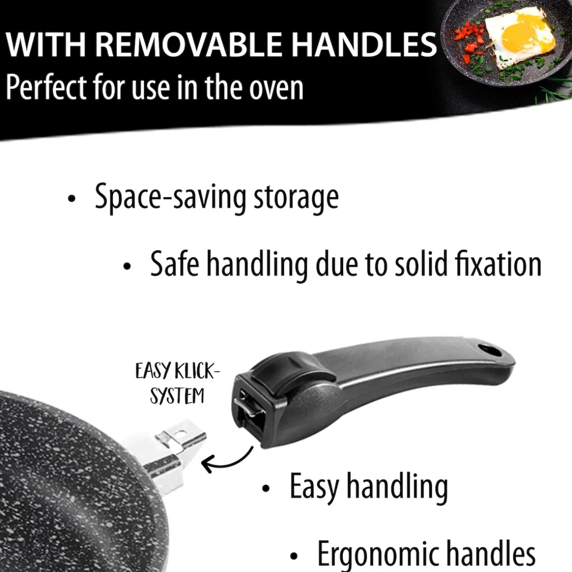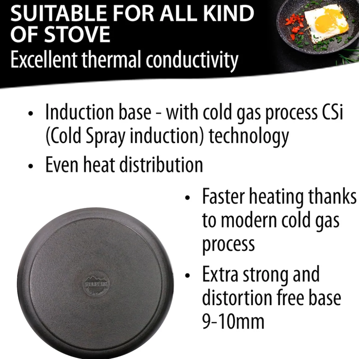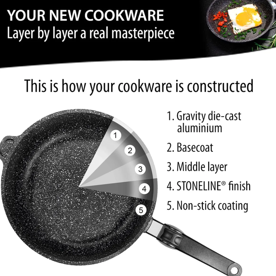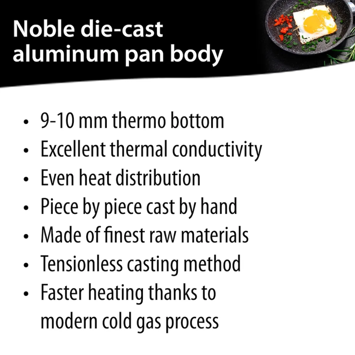 STONELINE Made in Germany! Gesund fettfrei kochen und braten! Das Qualitätsmerkmal „Hergestellt in Deutschland“ spricht bei diesem von Meisterhand gegossenen Kochgeschirr für sich. Dank des Aluminium-Kokillengusses bleibt das Kochgeschirr spannungsfrei und verzieht sich auch bei sehr hohen Temperaturen nicht. Der extra starke Boden liegt optimal auf dem Kochfeld auf, um die Hitze direkt aufzunehmen und gleichmäßig zu verteilen. Dadurch ist ein sehr energieeffizientes Kochen gewährleistet. Ihre Gerichte werden schonend zubereitet, Vitamine und Mineralien bleiben weitestgehend erhalten. Dank der sehr guten Wärmeleitfähigkeit ist das Kochgeschirr hervorragend zum Braten, Dünsten, Schmoren und Dämpfen geeignet. Nimmt man die Griffe ab, passt das Kochgeschirr auch prima in den Kühlschrank und ist sehr viel leichter und platzsparender zu verstauen. Dank unserer einzigartigen Original STONELINE-Antihaftbeschichtung lassen sich Ihre Speisen – je nach Wunsch – mit oder ohne Bratfett und Öl zubereiten und ganz ohne Ankleben aus dem Kochgeschirr lösen. Spitzenprodukt deutscher Wertarbeit: Die einzigartigen Pfannen von STONELINE stehen für Funktionalität und Qualität auf höchstem Niveau! Stück für Stück von Hand gegossen. 1 Handguss Wok, ø ca. 32 cm, Höhe: ca. 9,9 cm, ca. 5,3 l Körper aus Aluminium-Kokillenguss Stück für Stück handgegossen Hergestellt aus edelsten Rohmaterialien Spannungsfreies Gussverfahren Induktionsboden mit Kaltgasverfahren CSi (Cold Spray induction) Technologie Hervorragende Wärmeleitfähigkeit und gleichmäßige Hitzeverteilung Schnelleres Erhitzen dank modernem Kaltgasverfahren Extra starker, verzugsfreier Boden 9 – 10 mm Original STONELINE Antihaft-Beschichtung Weltweit einzigartige und kratzfeste STONELINE Antihaftbeschichtung mit echten Steinpartikeln Vitaminschonend kochen und braten ohne Fett und Öl Kein Anbrennen und kein Ankleben Verstärkter Schüttrand Einfaches und tropffreies Ausgießen Höhere Stoßfestigkeit Abnehmbare Griffe Ideal für den Einsatz im Backofen Kochgeschirr platzsparend verstaubar Sicher durch stabile Befestigung Einfache Handhabung Geeignet zum Braten, Dünsten, Schmoren, Dämpfen & Überbacken im Backofen Für alle Herdarten geeignet, auch Induktion Kochgeschirr ohne Griff backofengeeignet bis 260 °C Reinigungs- und Pflegetipps: Vor dem ersten Gebrauch empfehlen wir, Ihr Koch- oder Backgeschirr mit etwas Wasser und einem milden Spülmittel gründlich auszuwaschen. Verteilen Sie anschließend mit einem Papierküchentuch einige Tropfen Speiseöl auf der Beschichtung. Bei der weiteren Nutzung können Sie auf den Einsatz von Fett oder Öl verzichten! Dank dem Easy-Clean-Effekt wird die Reinigung per Hand empfohlen. Einfach mit heißem Wasser, Handspülmittel und einem weichen Schwamm auswischen.