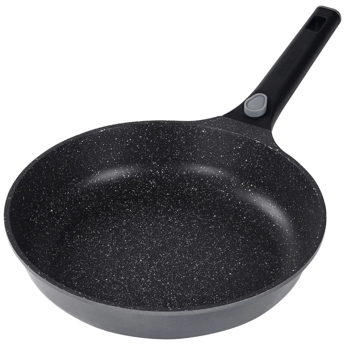 STONELINE – Das Original! Gesund fettfrei kochen und braten! STONELINE Smart – Das intelligente Kochgeschirr für deine Küche Mit der STONELINE Smart Serie wird Kochen, Backen und Servieren so einfach und flexibel wie nie zuvor! Das hochwertige Kochgeschirr aus Aluguss kombiniert durchdachte Funktionen mit modernem Design, langanhaltender Qualität und maximalem Komfort. Der abnehmbare Griff macht das Kochgeschirr besonders vielseitig: Spare Platz bei der Zubereitung auf dem Herd, beim Servieren auf dem Esstisch und bei der Aufbewahrung im Kühlschrank. Außerdem wird dein Kochgeschirr mit abgenommenen Griffen im Handumdrehen ofenfest. Du kannst die Pfannen beispielsweise als Auflaufformen zum Überbacken von Gerichten verwenden. Das spart Zeit und auch zusätzliches Koch- und Backgeschirr. Die Bratpfannen sind sehr geräumig und bieten ausreichend Platz, um auch größere Portionen problemlos zuzubereiten und zu wenden. So bleibt alles in der Pfanne und du kannst dein Gericht perfekt zubereiten, ohne dass etwas herausfällt. Ob Pfanne, Topf oder ganzes Topfset – die STONELINE Smart Serie überzeugt durch ihr robustes Aluminiumguss-Material und garantiert eine optimale Wärmespeicherung und ein energieeffizientes Kochen. Es ist für alle Herdarten geeignet, auch für Induktion. Dank der patentierten STONELINE Antihaftbeschichtung mit echten Steinpartikeln kannst du gesund fettfrei braten, ohne dass etwas haften bleibt oder anbrennt. Die Reinigung ist kinderleicht und spart dir Zeit – meist genügt es, die Pfanne oder den Topf einfach mit etwas Spülmittel, heißem Wasser und einem feuchten Tuch auszuwischen und das Kochgeschirr ist sofort wieder einsatzbereit. Lieferumfang: 1 Bratpfanne, ø ca. 28 cm, Höhe: ca. 6 cm, ca. 3,0 l, Induktionsboden: ø ca. 20 cmIn der Farbe: Grau Die wichtigsten Vorteile auf einen Blick: Weltweit einzige Antihaftbeschichtung mit echten Steinpartikeln Kratzfeste STONELINE-Antihaftbeschichtung Abnehmbare Griffe für flexible Einsatzmöglichkeiten Vitaminschonend kochen und braten ohne Fett und Ol Optimales Bratergebnis und kross gebratenes Fleisch Auch für Vegetarier geeignet: Gemüse bleibt knackig und saftig Kein Anbrennen und kein Ankleben Super leicht zu reinigen dank Easy-Clean Effekt Extra starker, verzugsfreier Boden Bodenstärke: ca. 4,5 mm Für alle Herdarten geeignet, auch Induktion Backofengeeignet bis 260 °C (ohne Griff) / 220 °C (mit Griff) Material: Aluminiumguss Reinigungs- und Pflegetipps: Vor dem ersten Gebrauch empfehlen wir, dein Koch- oder Backgeschirr mit etwas Wasser und einem milden Spülmittel gründlich auszuwaschen. Verteile anschließend mit einem Papierküchentuch einige Tropfen Speiseöl auf der Beschichtung.Bei der weiteren Nutzung kannst du auf den Einsatz von Fett oder Ol verzichten!Dank dem Easy-Clean-Effekt wird die Reinigung per Hand empfohlen. Einfach mit heißem Wasser, Handspülmittel und einem weichen Schwamm auswischen.