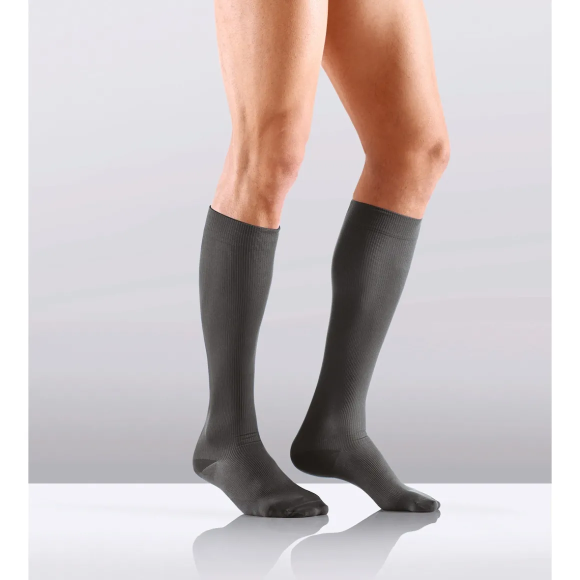 Ein anatomisch geformter Teil im Wadenbereich gewährleistet optimale Passform und Druckverteilung. Besonders angenehm ist das nachgiebige, nicht einengende Bündchen mit extra Garn, das für Halt sorgt, ohne einzuschneiden. Rutschfestigkeit garantiert die computergesteuerte Maschenregulierung, die den Strumpf exakt an Ort und Stelle hält – auch bei Bewegung.