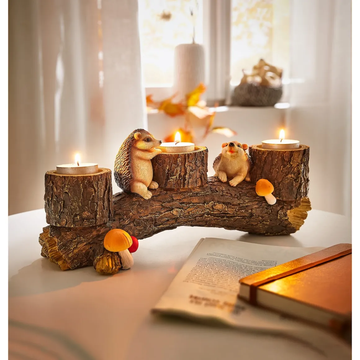 Die 2 possierlichen Igel sorgen in der dunklen Abendzeit mit Kerzenschein für Wohlbehagen im Wohnzimmer. Niedliches Detail sind die kleinen Pilze, die sich an die Deko anschmiegen.