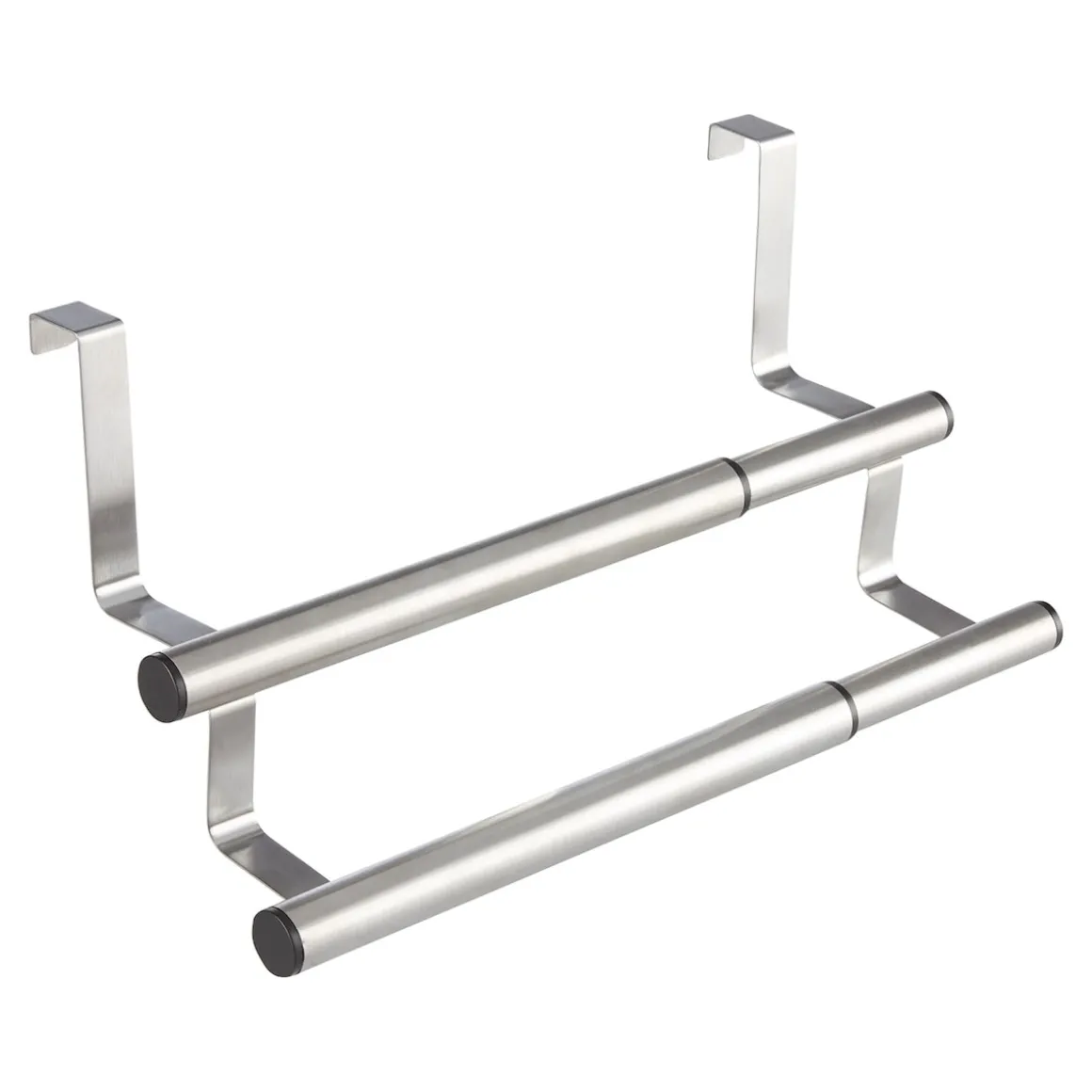 Hängen Sie diese edel glänzende Doppel-Handtuchstange einfach in die Tür von Küchenschränken & Co. ein – und haben das Hand- und Geschirrtuch immer parat. In der Breite individuell verstellbar.