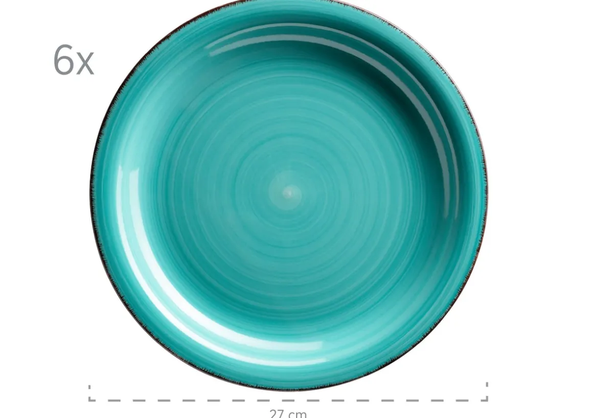 Langsam und mit Genuss statt schnell und in Hektik: Immer häufiger wird Wert auf Entschleunigung gelegt – vor allem beim Essen. Das passende Ambiente für ein gemeinschaftliches Erlebnis im Haus, im Garten, auf der Terrasse oder Ihrem Balkon schaffen Sie ganz leicht mit der rustikal anmutenden, handbemalten Kollektion LUMACA. Dieses Service enthält: 6x Speiseteller mit 27 cm Durchmesser 6x tiefe Teller (Suppenteller) mit 21 cm Durchmesser Die gesamte Serie LUMACA ist aus dickwandigem Steingut gefertigt. Mit den kreisförmig-verspielten Linienführungen kombiniert dieses Geschirr auf harmonische Weise klassische runde Formen mit einem farbenfrohen Vintage Look. LUMACA wird auch Ihren Esstisch zu etwas ganz Besonderem machen! Alle Service der Serie LUMACA sind dauerhaft spülmaschinen- und mikrowellengeeignet, und dadurch äußerst pflegeleicht. Dieses Tafelset wird in einer speziell für dieses Set entwickelten, vielfach getesteten Transportverpackung aus umweltschonenden Materialien versendet.